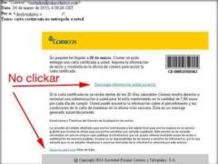 En abril de 2015 se detectó por parte de los agentes de la Comisaría de Vigo, la existencia de al menos cinco notificaciones a particulares y empresas de esta ciudad. En todos ellos, los mensajes enviados con el asunto “CARTA CERTIFICADA NO ENTREGADA A USTED”, contenían dos enlaces, uno de ellos con el texto “descargar información sobre su envío”, otro en el que indicaba ”haga click aquí”.