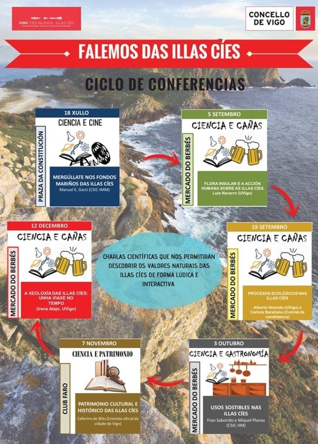 Tras o éxito das primeiras sesións «Ciencia e cinema: Mergúllate nos fondos mariños das Illas Cíes» e «Flora insular e interaccións humanas», celebradas en xullo e setembro respectivamente, cun aforo completo en ambos casos, nesta ocasión continúa a programación coa conferencia «Usos sostibles nas illas Cíes» que se celebrará no mercado gastrobar do Berbés, ás 20:30 horas.