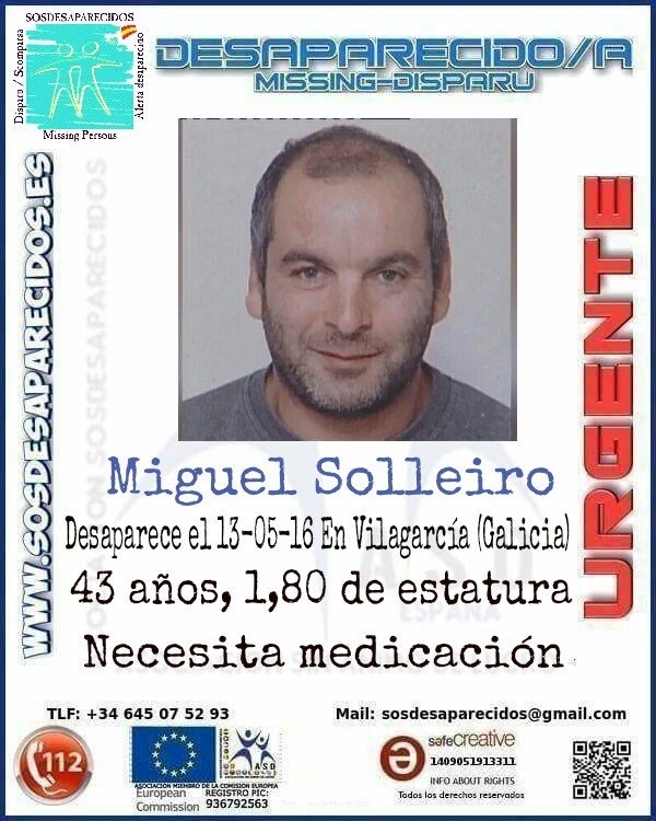 En el momento de su desaparición vestía pantalón vaquero negro, un camisa y botines color beige. Se llama Miguel Solleiro, tiene 43 años y es vecino del barrio arousano de A Lomba. Necesita medicación debido a que padece diabetes. Sus allegados han dado la alerta y puesto en conocimiento de la Guardia Civil que se encuentra en paradero desconocido desde el pasado viernes. A través de la red SOS Desaparecido han iniciado una campaña en redes sociales en busca de alguna pista que les lleve hasta su paradero.
