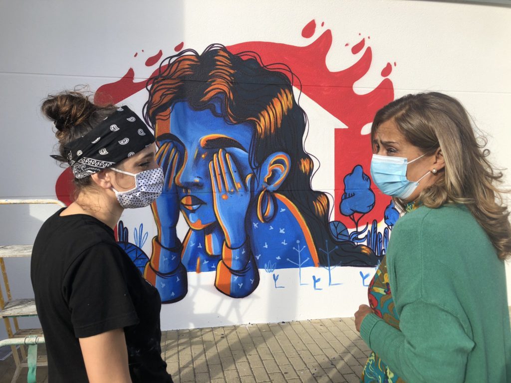 A presidenta, Carmela Silva, acompañada do alcalde de Tui, Enrique Cabaleiro, coñeceu esta tarde a obra desta muller, experta en deseño urbano e graffiti, que soubo poñer imaxe á situación de terror que viviron no confinamento durante a primeira onda da pandemia as mulleres e crianzas que se miraron obrigadas a convivir pechadas cos seus maltratadores.