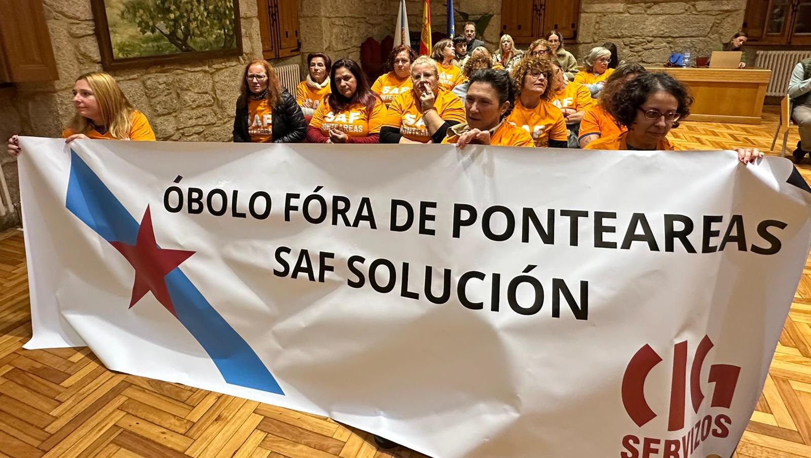 El personal del Servicio de Ayuda en el Hogar (SAF) de Ponteareas, en huelga indefinida desde el pasado 26 de septiembre, ha advertido este miércoles, tras pasar la noche en el interior de las instalaciones del Ayuntamiento, que lucharán hasta el final para conseguir que el Gobierno de la ‘popular’ Nava Castro rescinda el contrato con la concesionaria Óbolo, a la que acusan de ignorar buena parte de los derechos de las trabajadoras.
