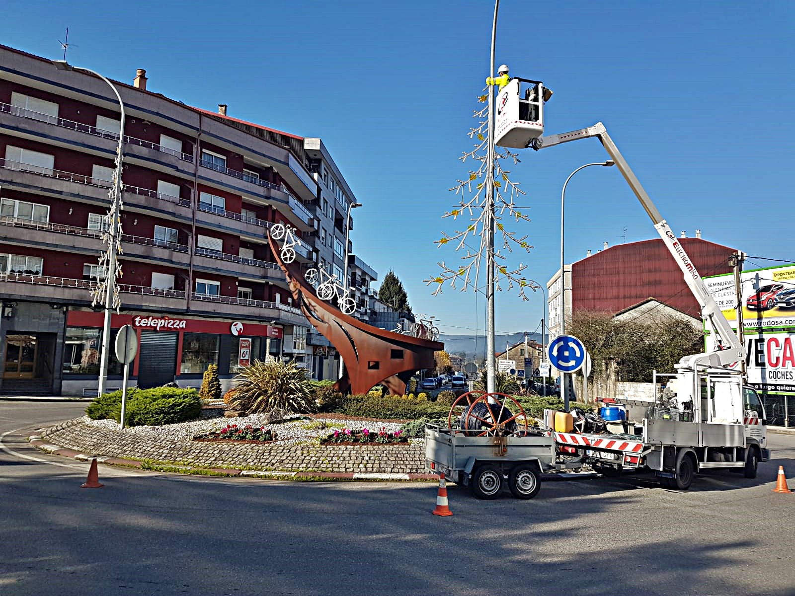 Las calles del casco urbano y las parroquias de Ponteareas acogen en estos días a instalación de la iluminación de Nadal. Un centenar de arcos y otros tantos elementos de iluminación empleados en el montaje, adornarán las calles de Ponteareas en el próximo mes de diciembre. Todos los motivos son fabricados con estructura de aluminio y díodos LED.