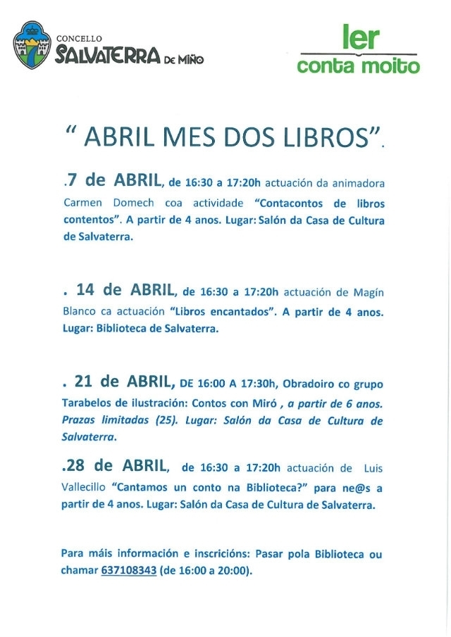 Un ano máis con motivo da celebración do día do libro o Concello de Salvaterra de Miño prepara unha programación especial para a biblioteca durante todo o mes, baixo o lema ‘Abril mes dos Libros’.