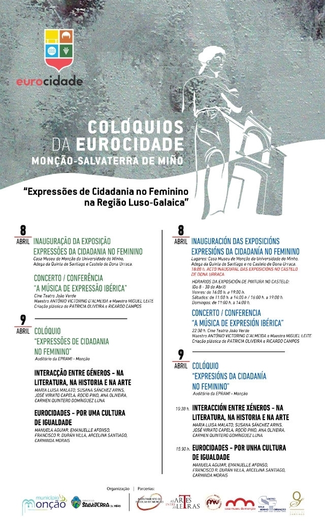 El sábado 9 de abril tendrán lugar los coloquios, en la auditoria da Eprami- Monçao, que serán inaugurados a las 10.30 por el Alcalde de Salvaterra de Miño y el Presidente de la Cámara de Monçao. La comisión científica estará formada por Luísa Malato, profesora de la Facultad de Letras de la Universidad de Porto, Graça Guedes, profesora de la Universidad de Porto y José Viriato Capela, profesor de la Universidad del Miño y Presidente de la Casa Museo de Monçao. El primer panel se abre a las 11.00h y versará sobre la interacción entre géneros, en la literatura, en la historia y en el arte. Tendrá como moderadora a Nassalete Miranda e intervendrán María Luísa Malato, Susana Sánchez Arins, José Viriato Capela, Rocío Pino, Ana Oliveira y Carmen Quintero Domínguez Luna. A las 15.30 horas se abrirá el segundo y último panel que estará enfocado en la cultura de la igualdad y que tendrá como moderadora a Graza Guedes e intervienen Manuela Aguiar, Emanuelle Afonso, Francisco R. Durán Villa, Arcelina Santiago y Carminda Morais.