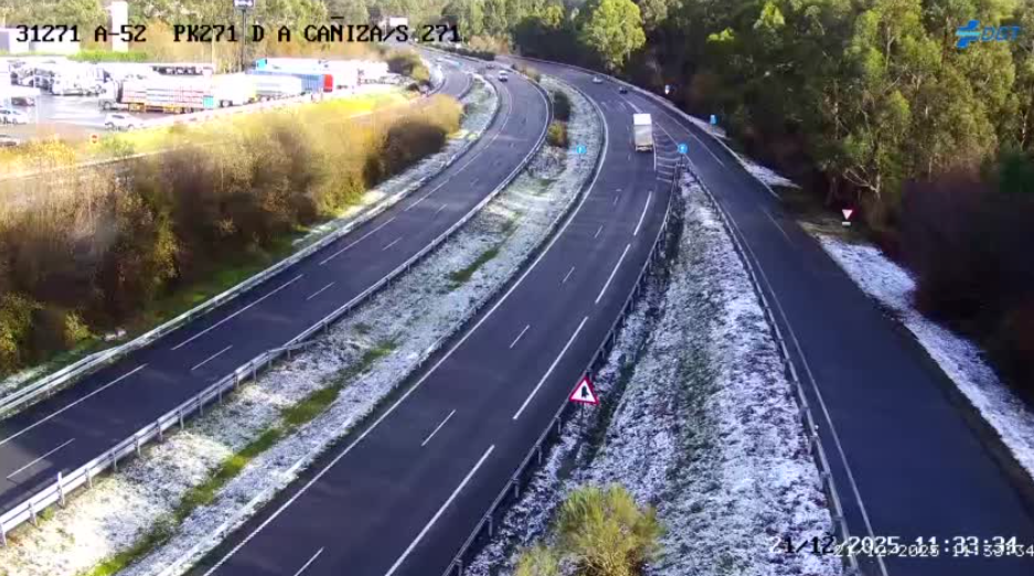 También la Autovías das Rías Baixas (A52) presenta problemas. En este caso se trata de obras entre los puntos 273.8 y 275.2. La nieve no está presente en la calzada, pero se recomienda precaución. Además, entre los kilómetros 266 y 270 se prohíbe adelantar a los vehículos pesados en ambos sentidos por las nevadas.