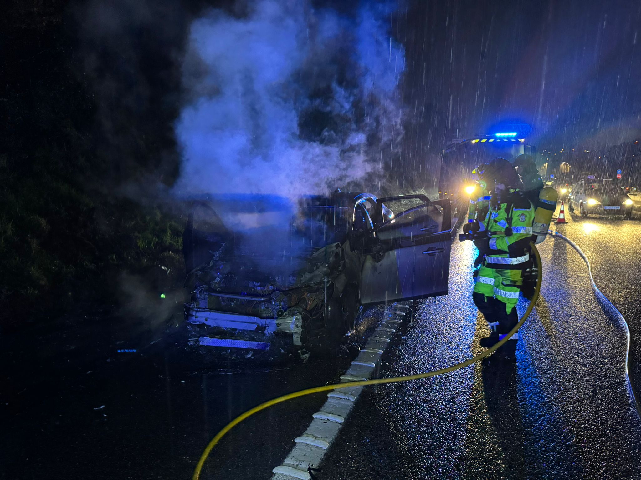 Sucedió sobre las 19:30 horas en el kilómetro 12 de la autovía A55, a la altura de Mos y en un punto de concentración de accidentes. En esta ocasión fue un coche marca Volvo que acabó siendo calcinado por las llamas.