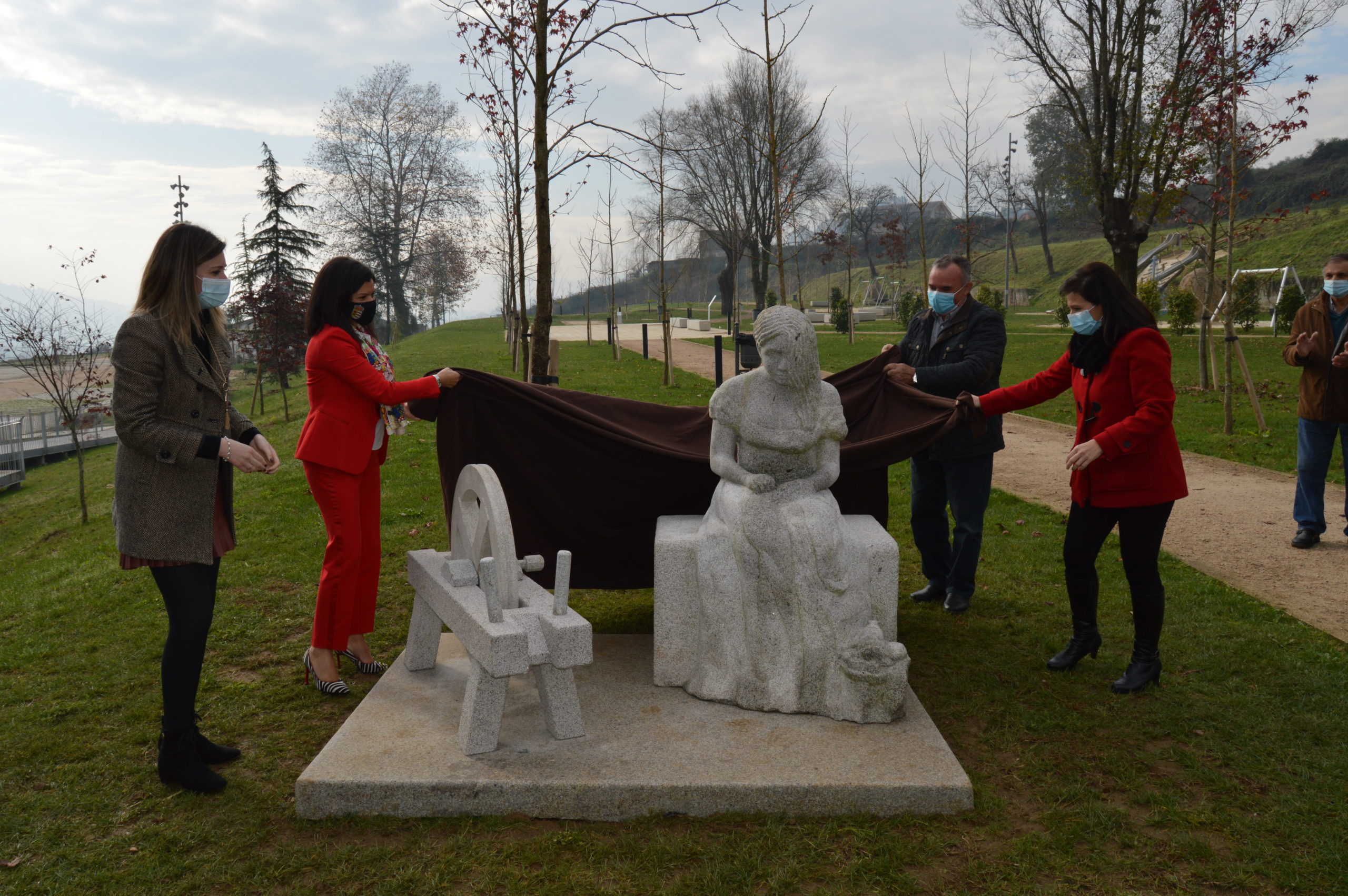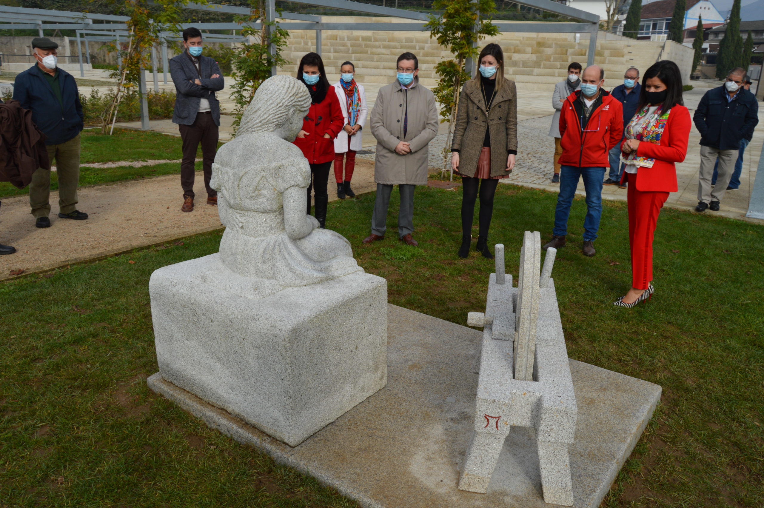 Os xardíns da contorna do Pazo de Mos, recentemente galardoado coa Q de Calidade, foron escenario este martes do acto de presentación da escultura dunha costureira, instalada tras ser doada pola Escola de Cantería á Comunidade de Montes de Mos.