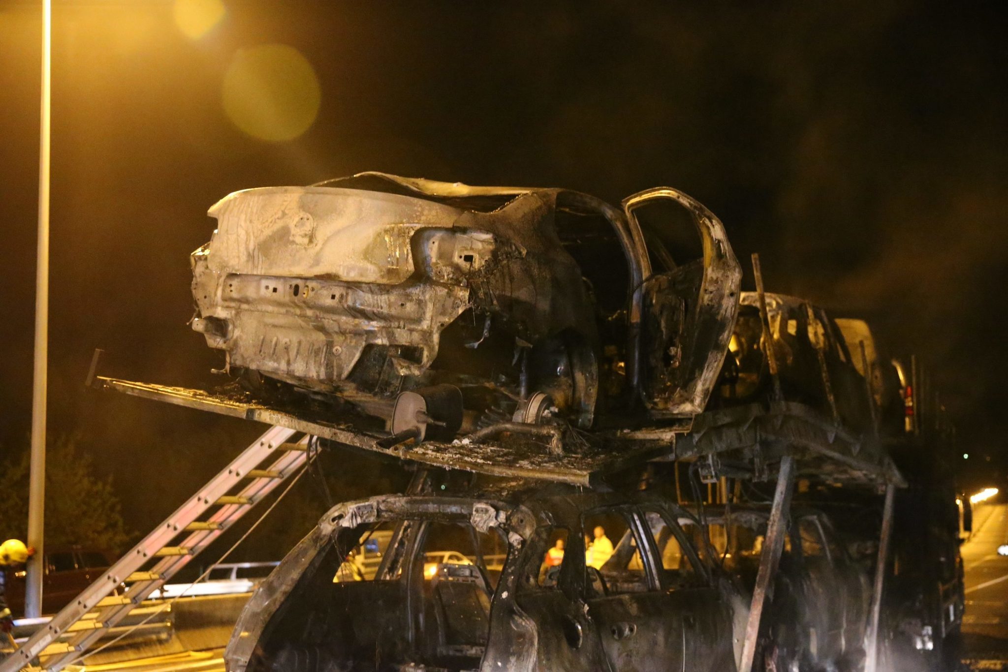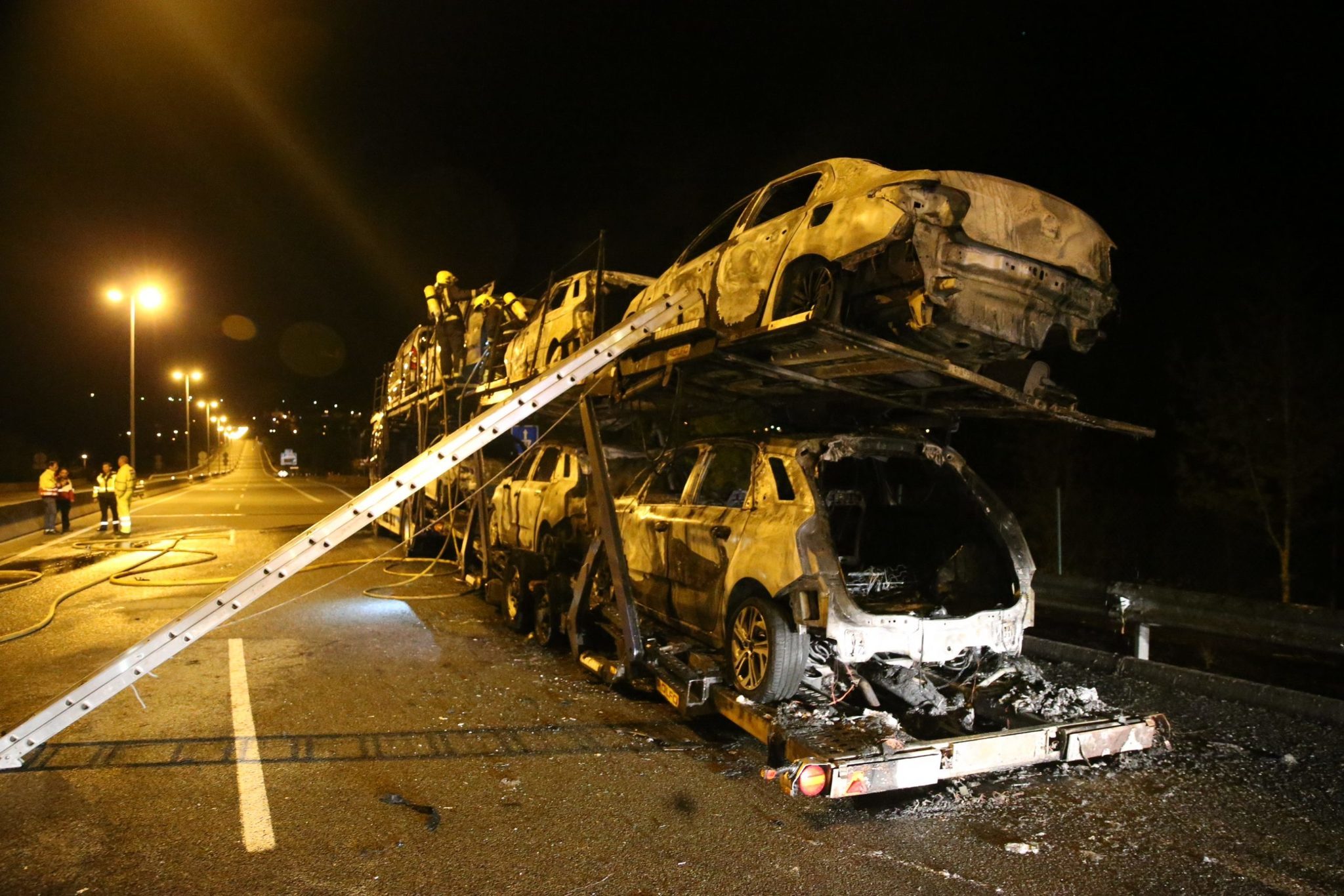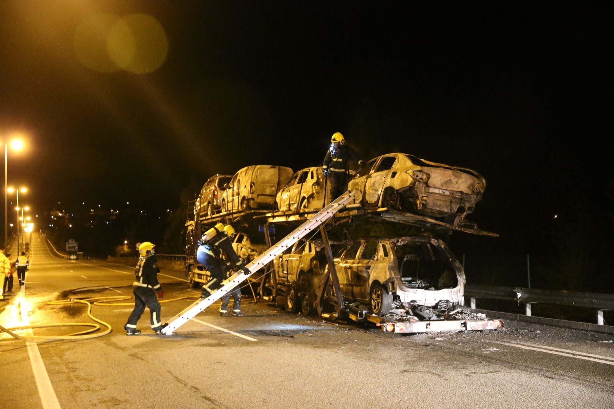 Los hechos se registraron unos minutos antes de las doce de la noche en la salida del peaje de la autopista AP9 en O Porriño cuando se declararon las llamas en la rueda del camión, según explicó el propio conductor. A pesar de los intentos por extinguirlo, el hombre nada pudo hacer. El fuego se propagó con una gran velocidad al resto del vehículo pesado y arrasó los coches que transportaba desde Vigo (dos Berlingo y cuatro C4).