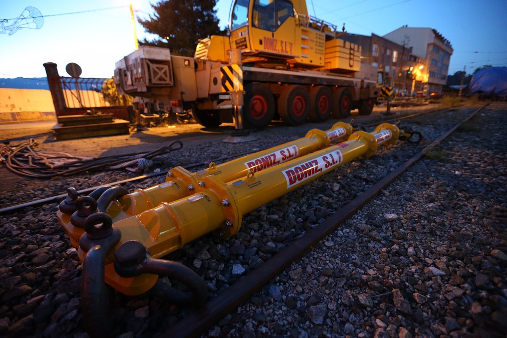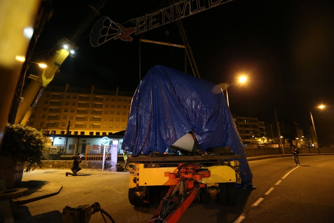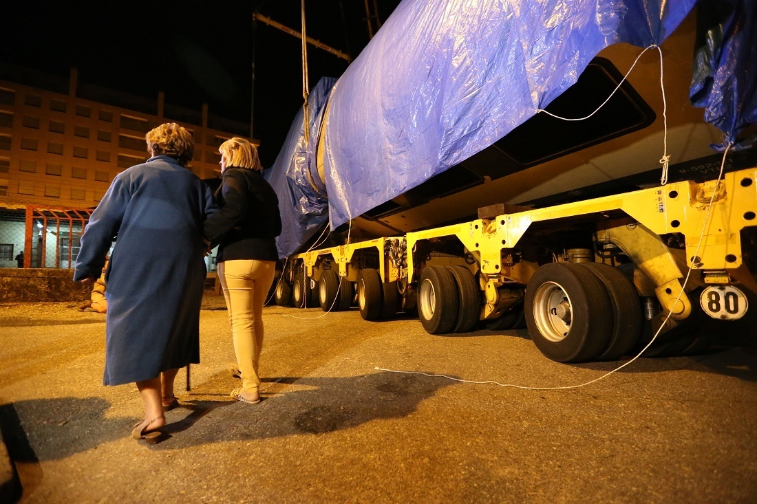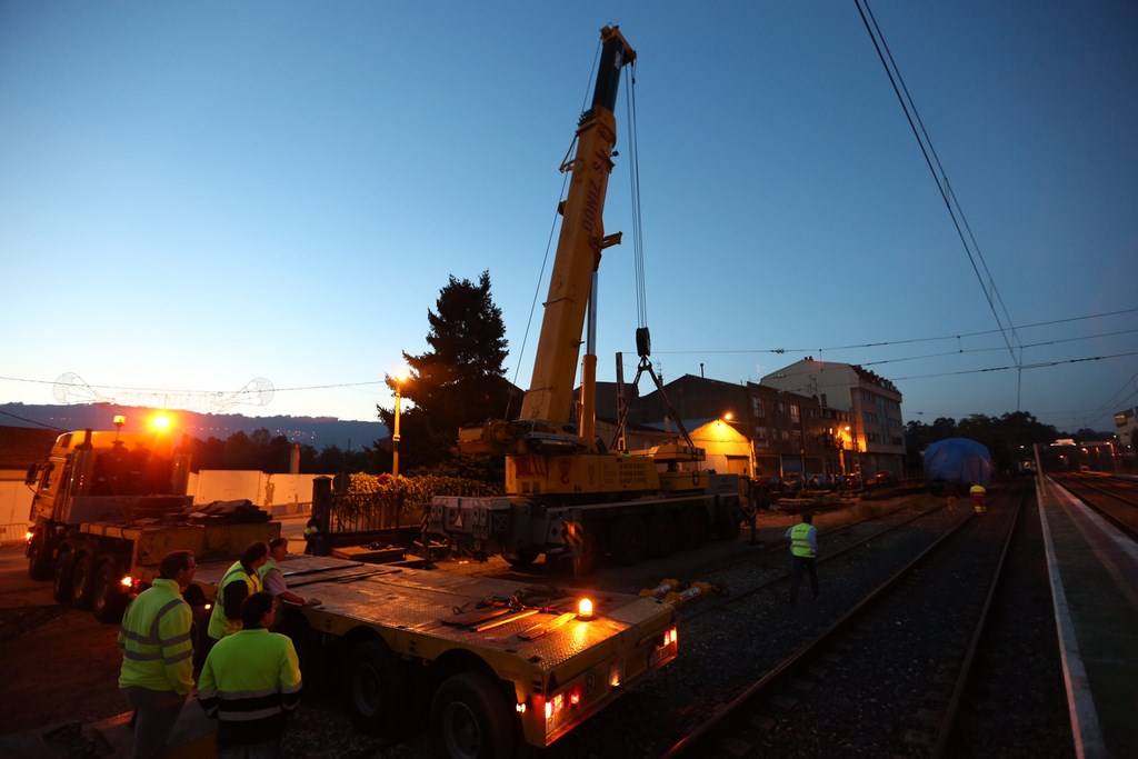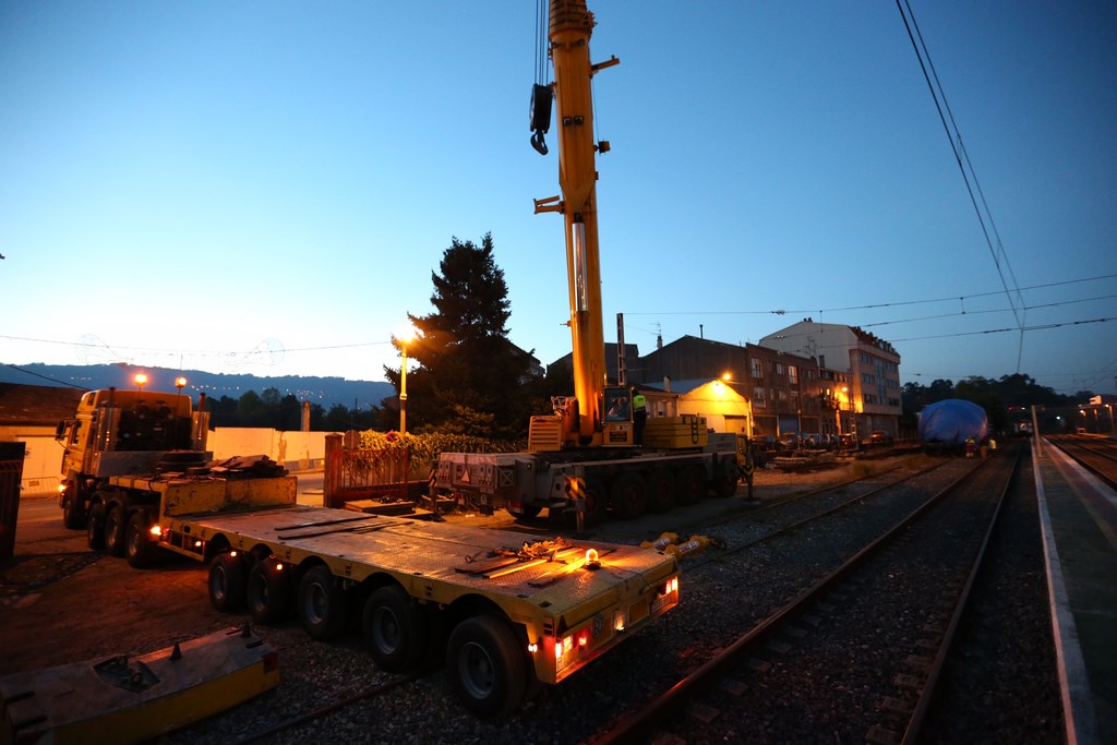 Personal de la empresa Doniz trabajó toda la tarde de este lunes para colocar los separadores con los que pasada la medianoche levantó la máquina del Tren Celta para depositarla sobre el transporte que la llevaría por carretera hasta el polígono de A Granxa
