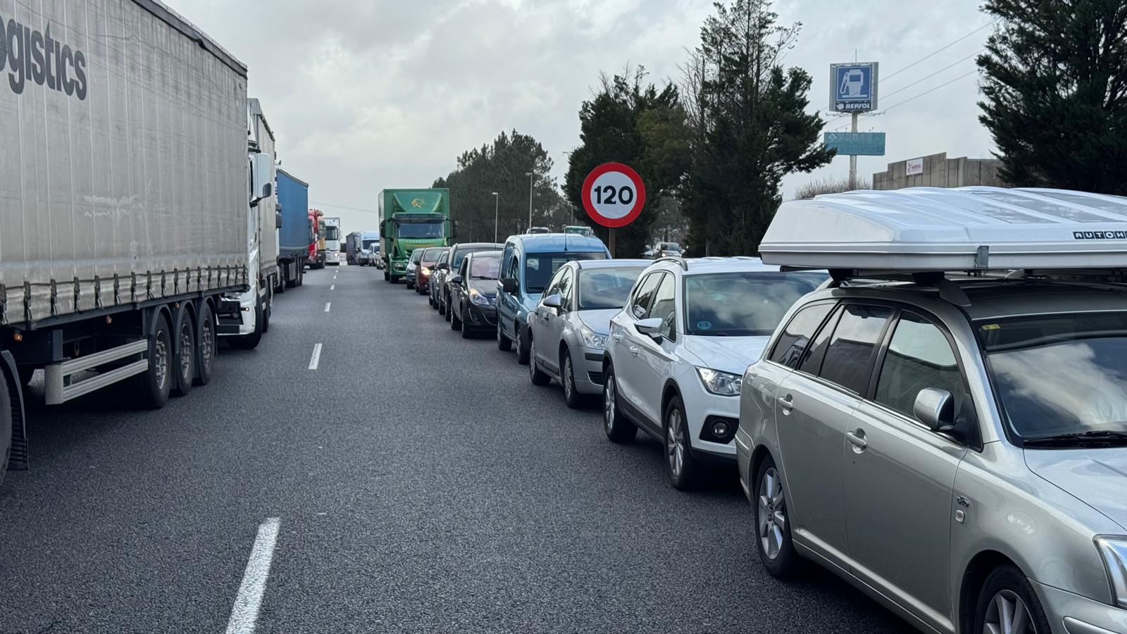 La autovía A55, una de las arterias de comunicación más transitadas del sur de Galicia, se encuentra en estos momentos bloqueada a la altura de la parroquia de San Salvador de Budiño, en el término municipal de O Porriño, y en sentido Tui.