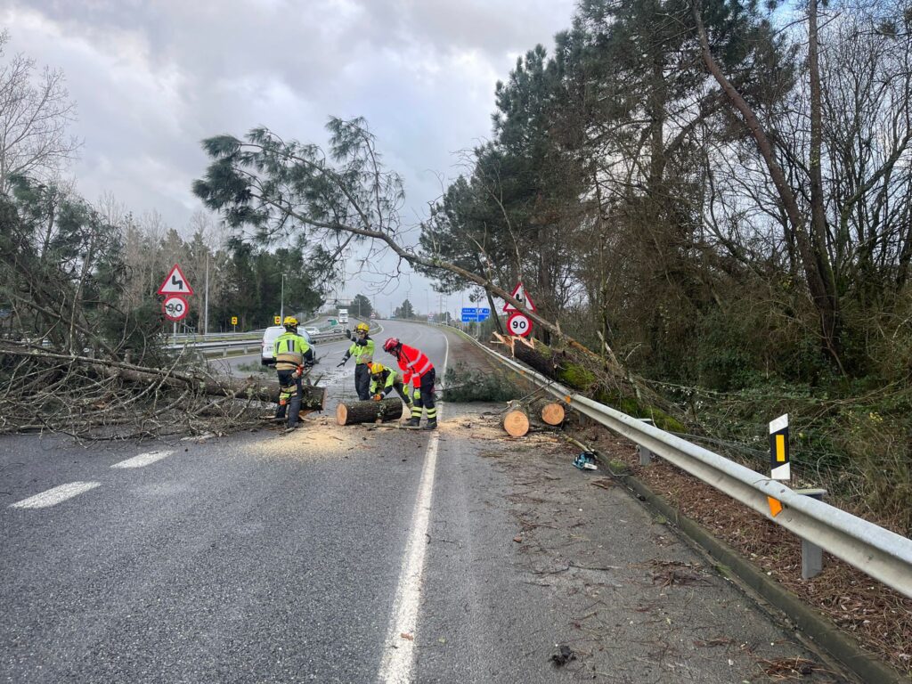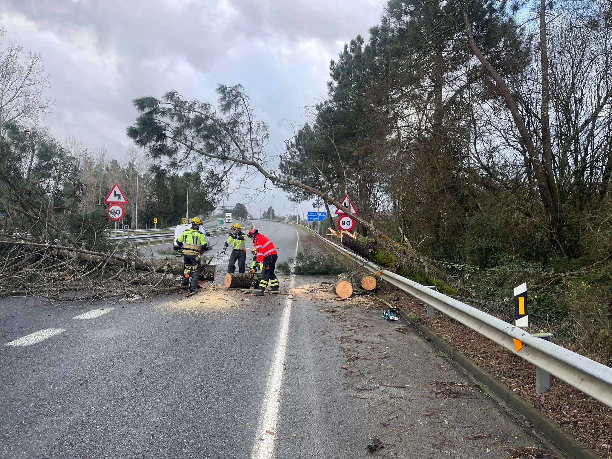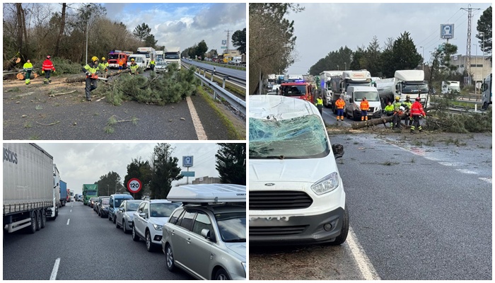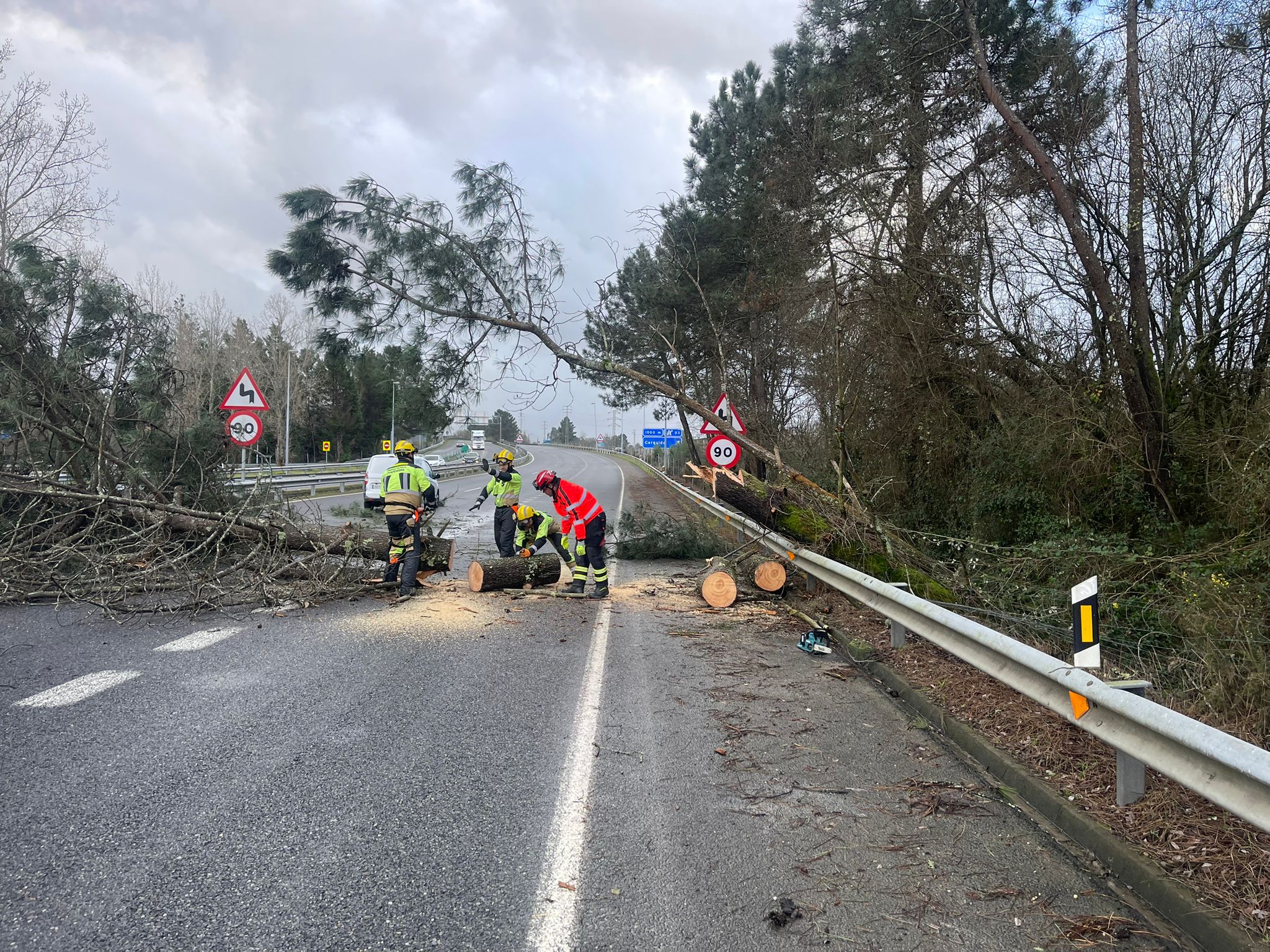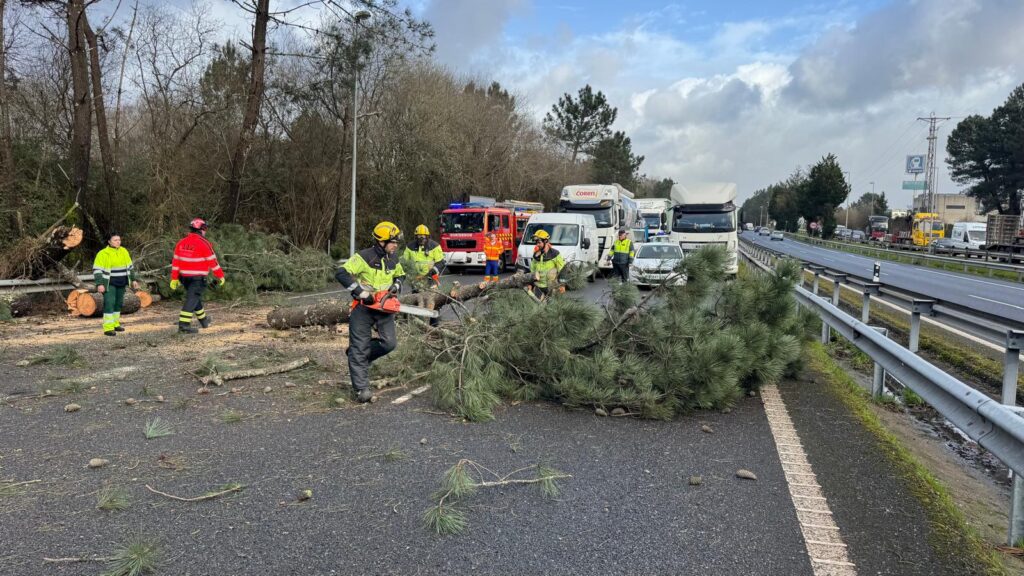 El escenario en el kilómetro 22 es de una actividad frenética. Los bomberos se encuentran trabajando sobre el asfalto para trocear y retirar los restos del árbol con la mayor celeridad posible. Las labores se centran en liberar el vehículo atrapado y limpiar los carriles para restablecer la normalidad en una de las principales conexiones entre Vigo y la frontera lusa.