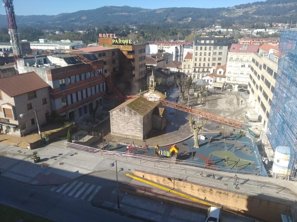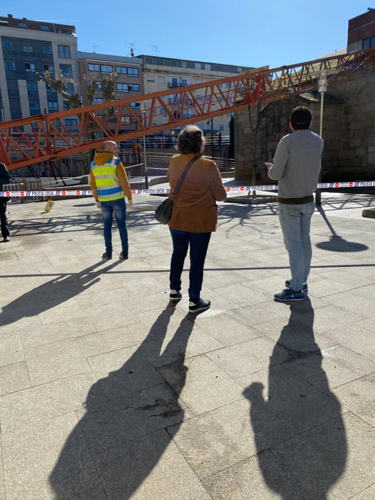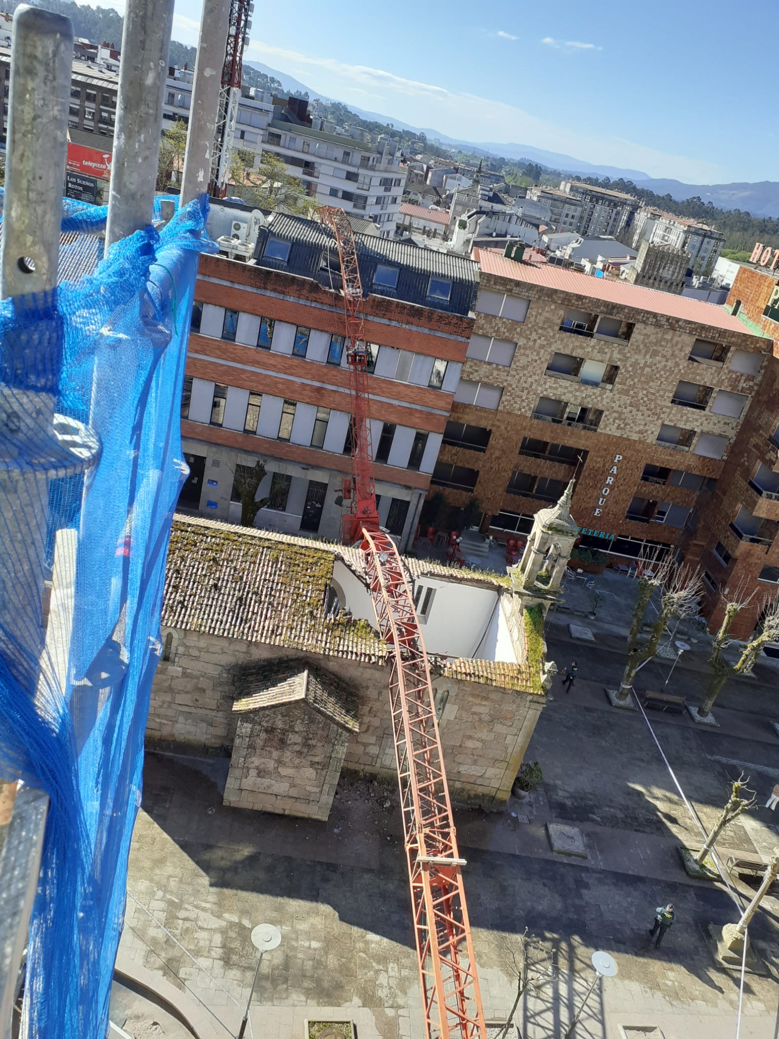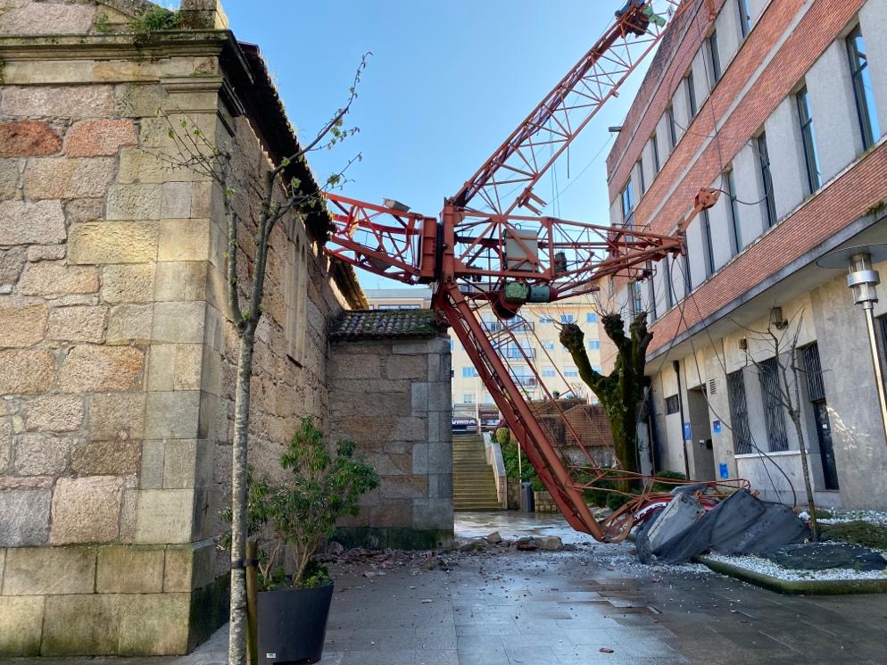 Según ha informado el Concello de O Porriño, el incidente se produjo a las 10.40 horas al caerse esta grúa, perteneciente a una obra cercana. También se han visto afectados un muro del hotel Parque y la cubierta del edificio de Telefónica. Tras una primera inspección se ha constatado que las imágenes religiosas están indemnes.