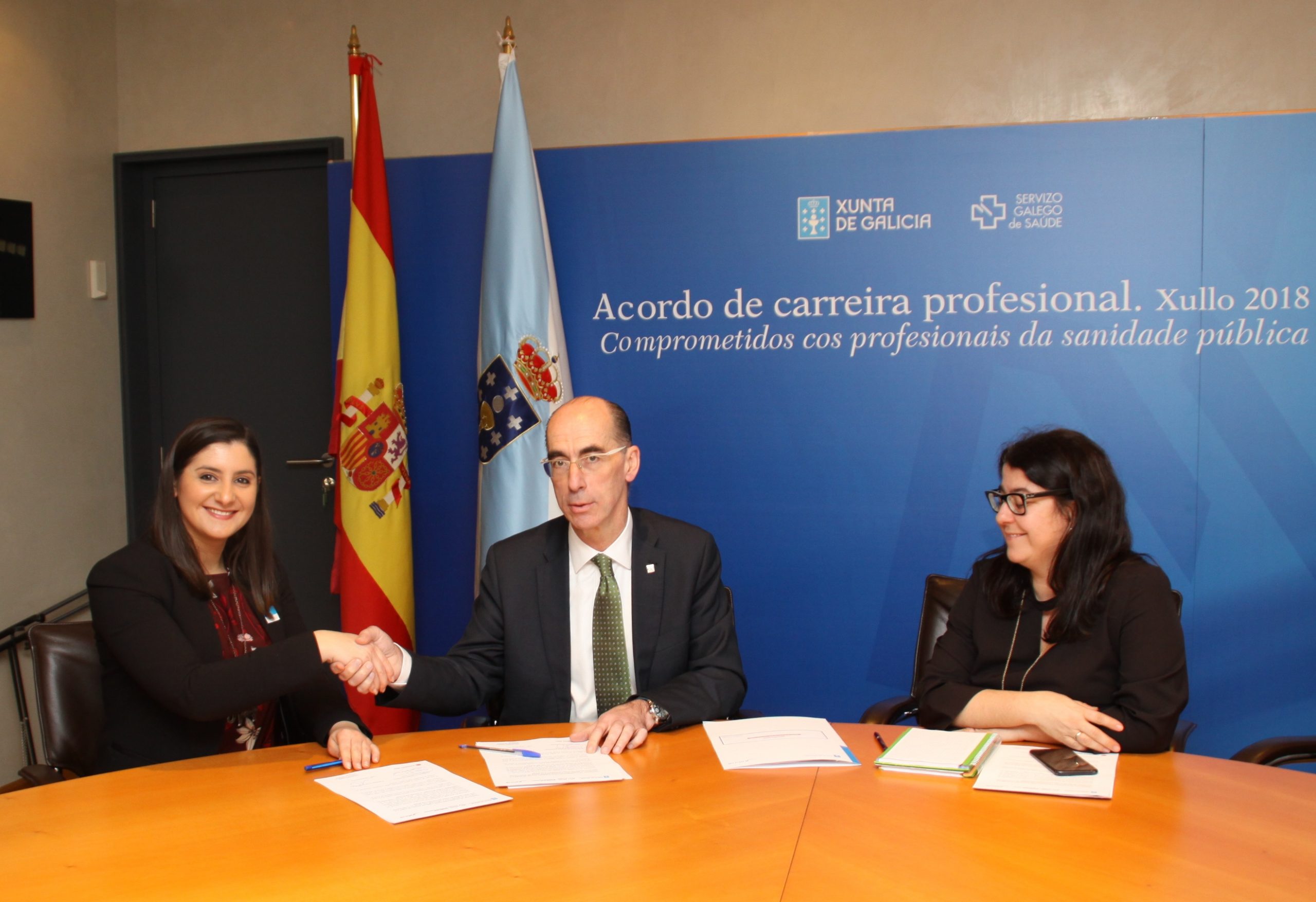 O conselleiro de Sanidade, Jesús Vázquez Almuiña, e a alcaldesa de Moaña, Leticia Santos Paz, asinaron no Edificio Administrativo de San Lázaro un protocolo de colaboración entre o Servizo Galego de Saúde e o Concello de Moaña, para a execución das obras de construción dun novo centro de saúde, que supón un principio de acordo para avanzar na contratación do proxecto de construción en canto o concello poña a parcela a disposición da administración sanitaria galega.
