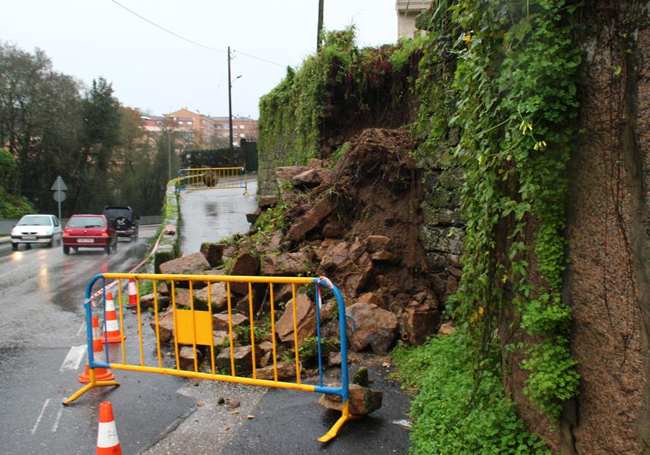 Otra de las consecuencias del agua fue la caída de muros. En Redondela se produjeron hasta tres derrumbes. Uno en la N-552 de tierra sin excesivas consecuencias. Más grande fue el producido en la N-550 en Cesantes, que tapó el arcén y parte de un carril de la carretera. El tercero se produjo en Reboreda, en la rúa O Carballo. Esta calle permaneció cerrada durante toda la jornada.