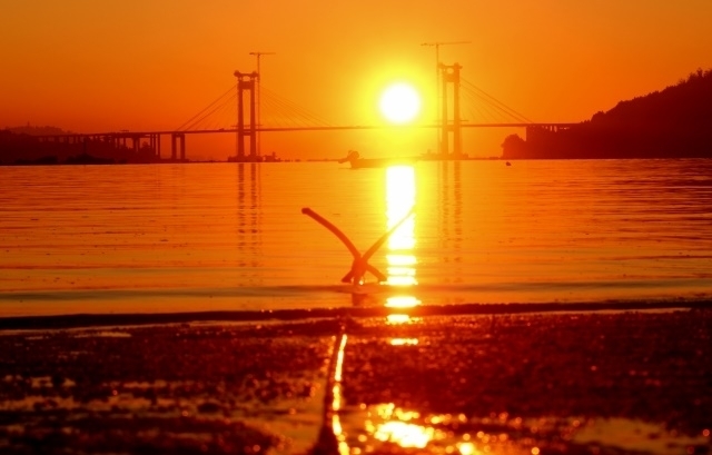 Uns días ó ano, os máis curtos, o sol cae entre os piares da Ponte de Rande. Por aí afástase ata o día seguinte e dende a praia de Cesantes poden facerse unhas belas fotografías, se o tempo o permite. Este mércores, sen unha nube no ceo, era un deses ideais para tomar a cámara e inmortalizar o momento. Unha cita anual cumprida, os máis remolóns, aínda poderán aproveitar o que queda de semana. A previsión e de ceo despexado. Despois, as gaivotas, o vento, as ondas, as chalanas e o ollo do artista determinan a instantánea final.
