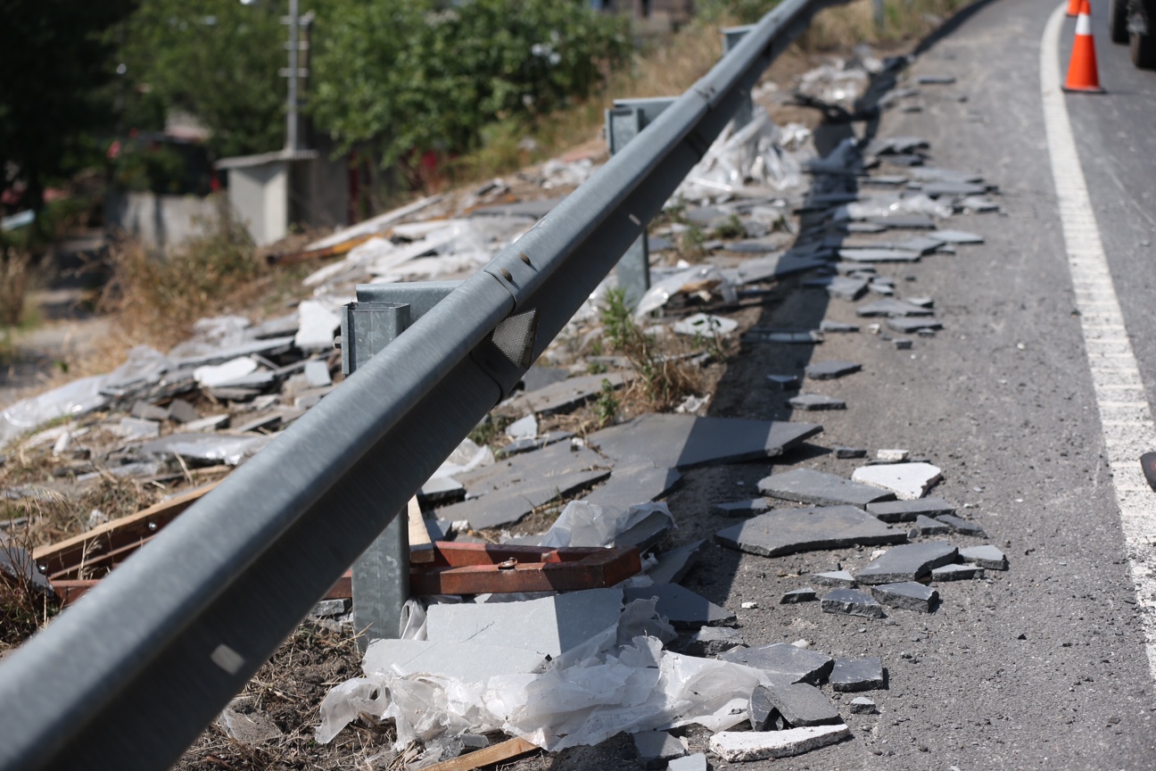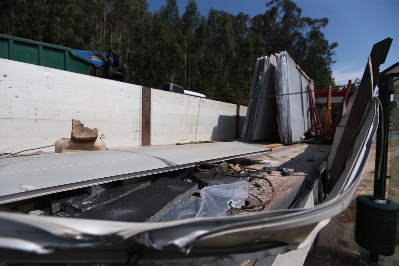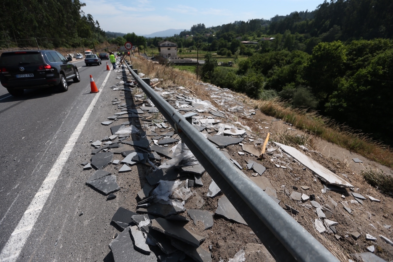 El material que transportaba el camión, planchas de granito, quedó esparcido en la calzada y dificultó el tráfico. El propio conductor del vehículo llamó al 112 Galicia para alertar de que las placas que transportaba se habían caído en el arcén de la carretera, provocando daños en el mobiliario urbano y en varias farolas del alumbrado público.