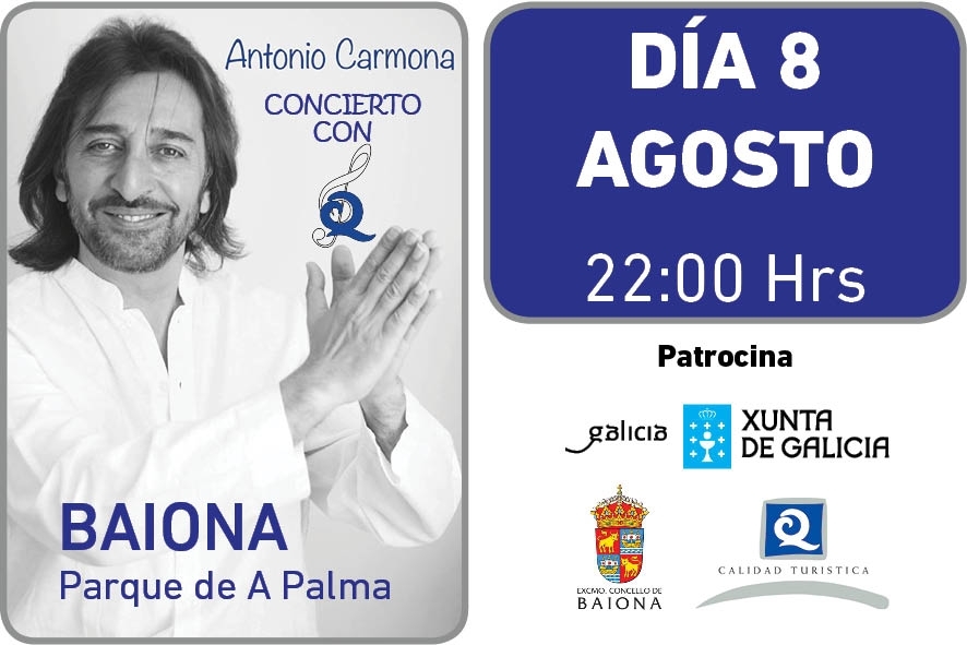 El primero de estos arrancará el próximo 8 de agosto en Baiona (Pontevedra) con la colaboración de la Xunta de Galicia y el Concello de Baiona. El artista principal será Antonio Carmona que actuará con La Negra, como artista invitada, y Mongin, además del grupo local, Chamizo’s Quartet. El concierto se celebrará a las 22.00 horas, en el parque de La Palma.
