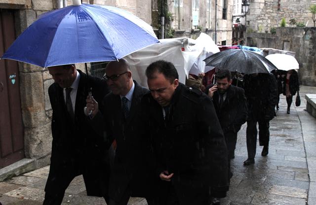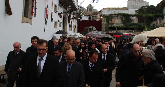 Anteriormente, la jornada comenzó algo torcida porque el fuerte viento y la amenaza de la lluvia traslado los actos al interior del Multiusos y no se pudieron celebrar al pie de la escultura de Pinzón, como estaba previsto. El cambio de ubicación fue un acierto porque, justo en el momento de comenzar a caminar la comitiva oficial, empezó a llover sobre Baiona. Primero de forma débil y, a continuación, con cierta fuerza de forma que la comitiva organizada pasó a un caminar por grupos y paraguas en mano hacia el destino.