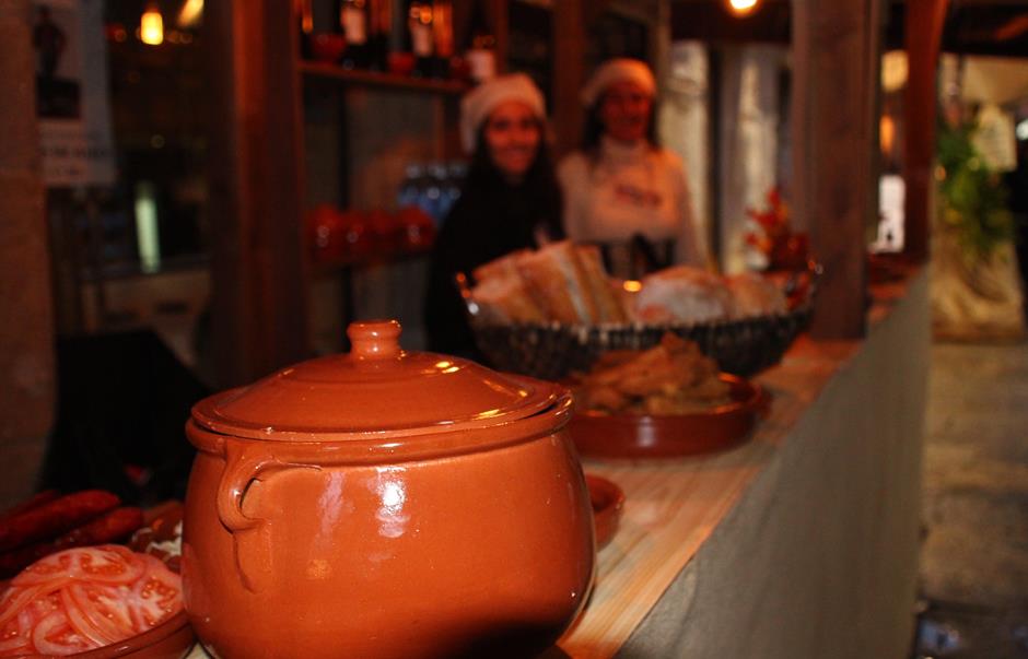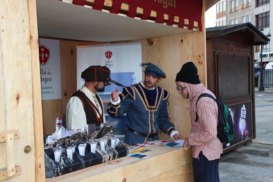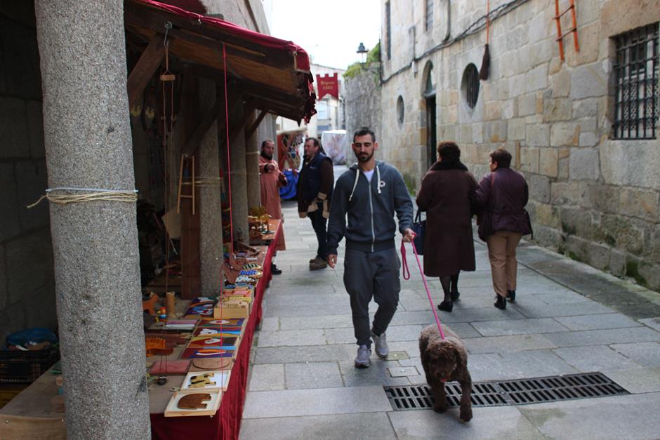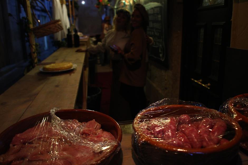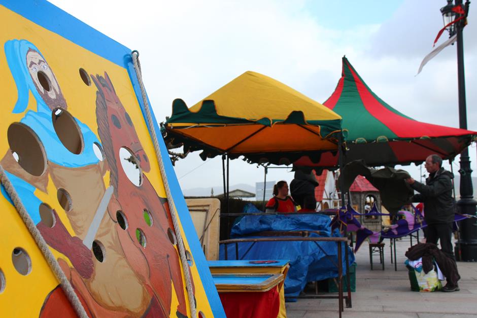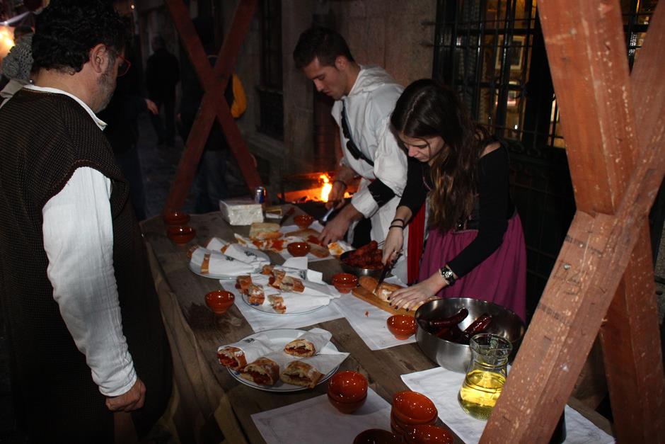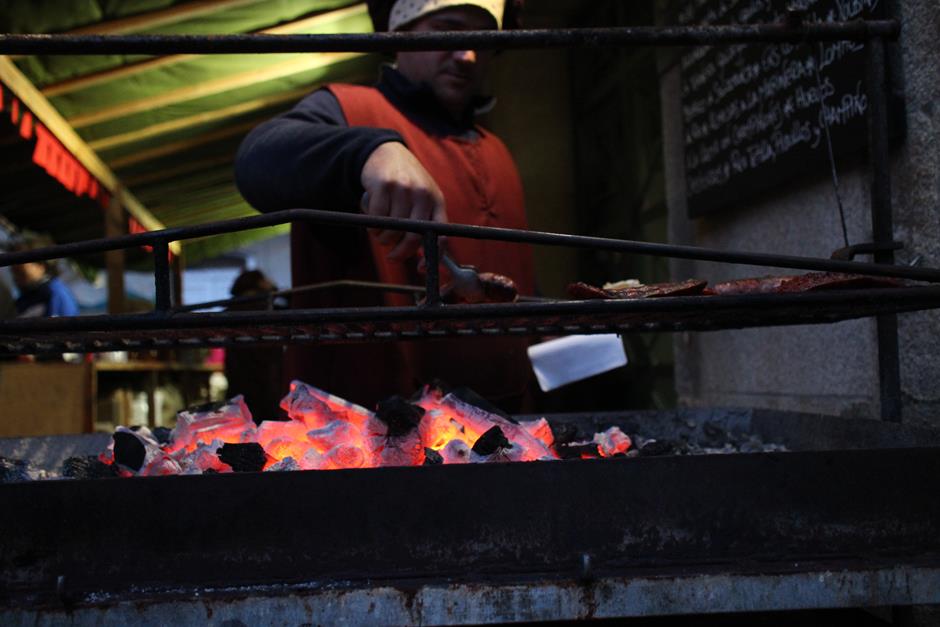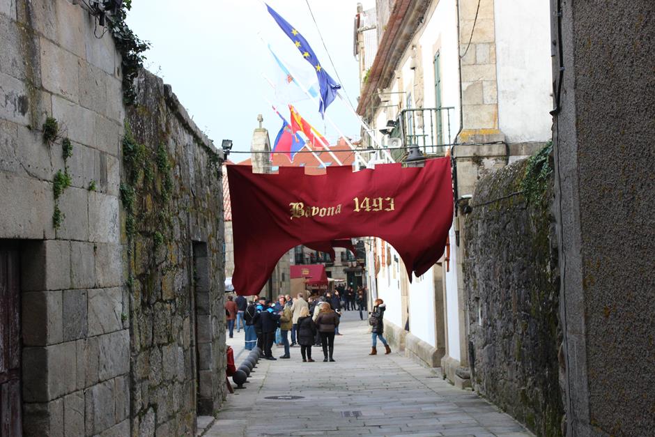 De vez en cando choveu un pouco. Era preciso que os visitantes chegados a Baiona, este venres foron relativamente poucos pero deixáronse ver no casco histórico, buscaran refuxio en cada chuvasco. O mellor lugar para atopalo era nos postos de comida. Había de todo, empanada, chourizos ou doces. O seu característico arrecendo enchía as estreitas rúas e o bandullo comezaba a pedir. Foi complicado saír das pequenas rúas sen probar algúns dos alimentos. Aínda que, entre todos eles, destacaba un porco enteiro e pendurado dun ferro do monte. Por debaixo as brasas ían facendo o seu traballo…