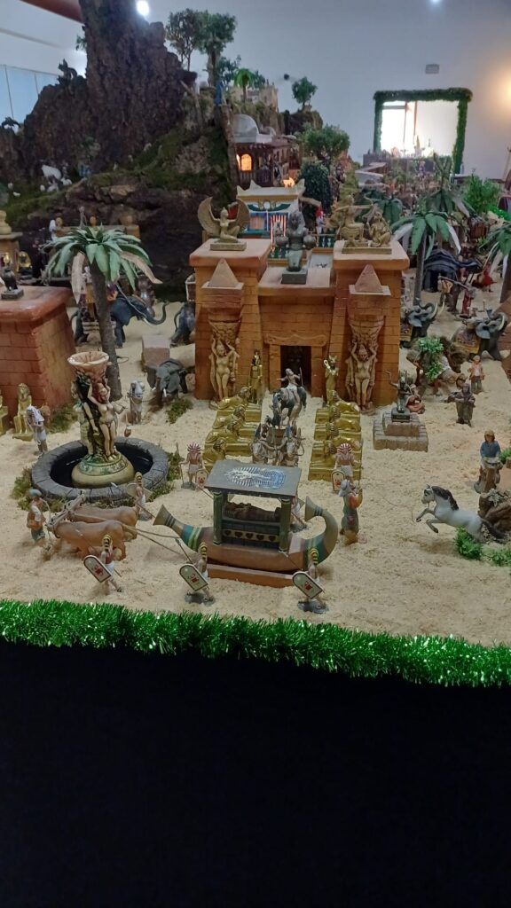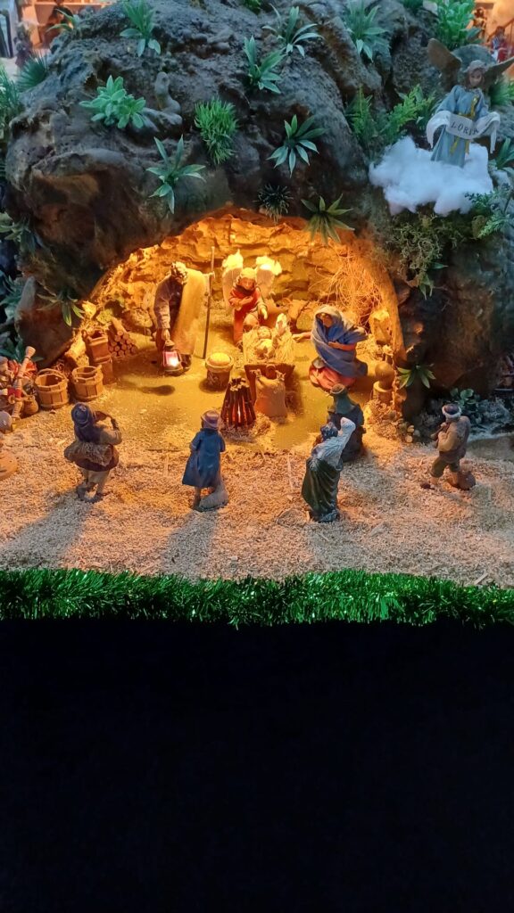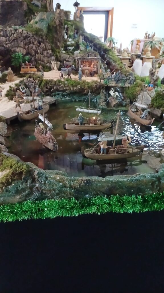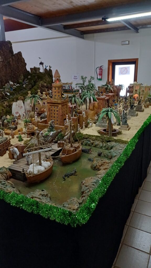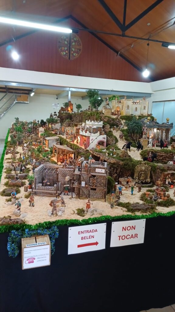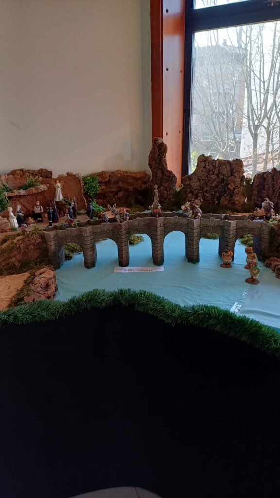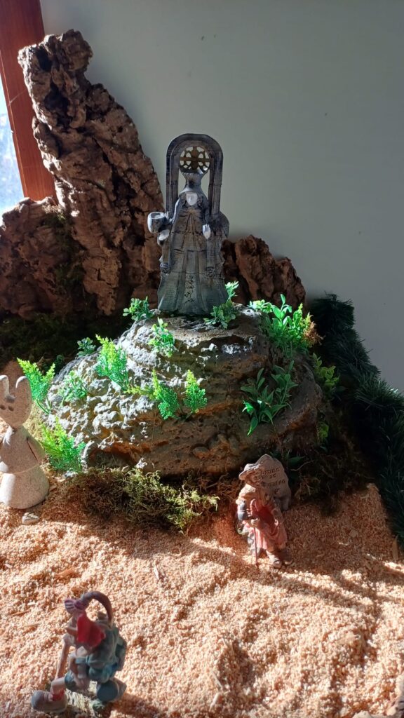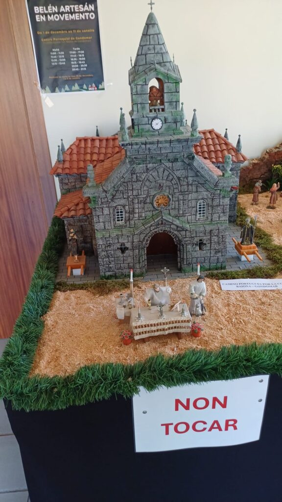 Pero es que, además, este año, «como la cabecita no para», Fernando ha decidido elaborar un segundo Belén. Uno, digamos, más galaico. Lo cuenta él mismo a Vigoé: «Es un guiño al Camino Portugués por la Costa, desde Baiona hasta Gondomar. Comienza con la Virgen de la Roca en su monte, que la hice yo; después te vas por el Camino Real, que es desde Baiona hasta Sabarís, te encuentras con la Fuente de los Gafos y la Fuente del Pombal. Continúas camino y te encuentras, llegando a Ramallosa, con la Capilla y el Crucero de San Campio. Seguimos caminando y nos encontramos con el puente de estilo románico del siglo XII, una réplica. Seguimos caminando y nos encontramos con el Cruceiro de Mañufe, con su culebrón enroscado. Y seguimos caminando y nos encontramos con una réplica de casi un metro cuadrado de la Iglesia de San Benito, con San Benito y San Cristóbal fuera. Tenemos una misa de campaña con don Víctor, que es el cura, y con Roberto, el sancristán. Y ahí termina el Camino de Santiago», explica.