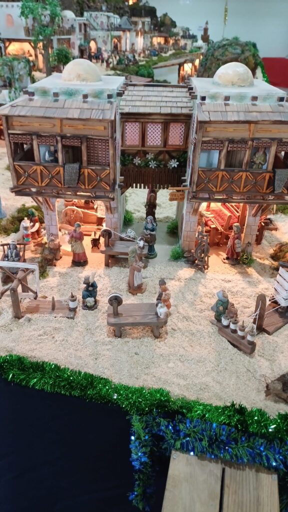 En el Belén de Fernando de las fuentes brota agua, en los campanarios tañen las campanas, el cura alza los brazos y con ellos el cáliz y la hostia sagrada; el monaguillo agita una incensario. «Y tengo ahí representados prácticamente todos los trabajos tradicionales perdidos, desde el paragüero hasta la elaboración del lino, la elaboración de las tejas, los castañeros, como hacían antes», sigue contando Fernando, en cuyo Belén hay espacio para homenajear a familiares y amigos: «Tengo un guiño a mi hija, o a un compañero que es ceramista le tengo también una casa con sus cerámicas. Y otro que tiene un bar, también le puse el nombre de él».
