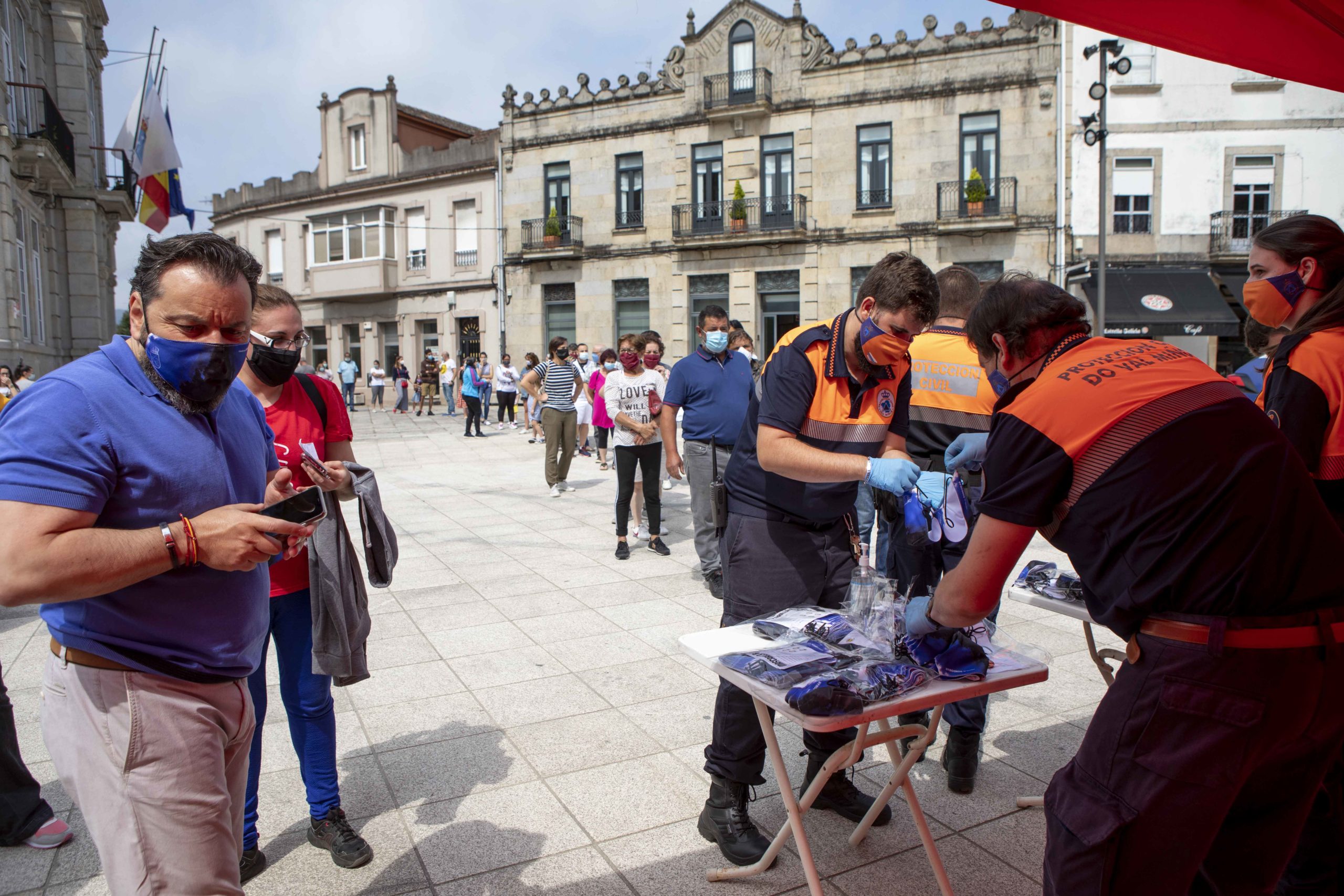 Durante la mañana y la tarde de este miércoles varios cientos de personas se acercaron hasta la Praza de A Paradela, donde efectivos de Protección Civil hacían entrega de las mascarillas, donadas y fabricadas por la empresa PMAS Full Sport, industria ubicada en el Polígono de A Pasaxe, y que ha adaptado parte de su producción a su confección durante el confinamiento con el fin de mitigar la ausencia de material que se registró durante esos días.