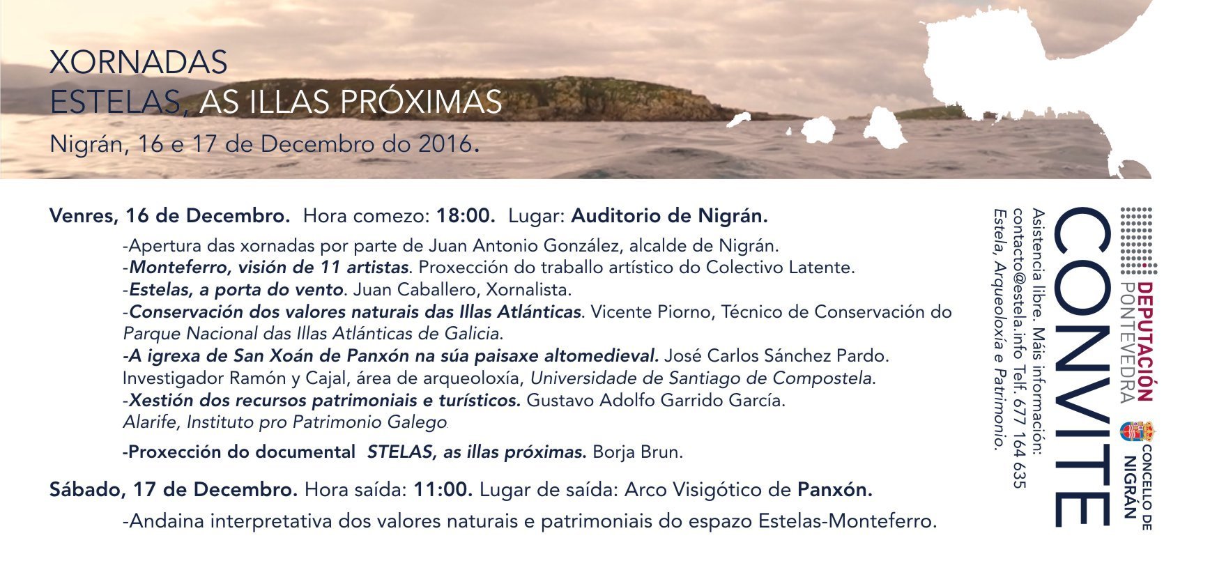 O broche final a esta xornada do venres a porá o estreno do documental «Stelas, as illas próximas», realizado polo cineasta galego Borja Brun e que condensa en 10 minutos de filme a beleza do entorno das Estelas-Monteferro-Panxón mediante imaxes aéreas, terrestres e subacuáticas. Un traballo que se moverá nas redes sociais e se levará a Fitur o vindeiro ano. «É unha visión artística do autor que non fai máis que reflectir a espectacularidade deste espazo», sintetiza González.