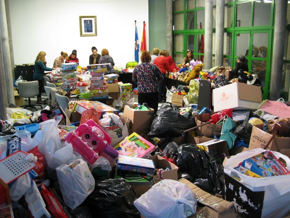 Dende as cinco da tarde do xoves, decenas de voluntarios empaquetan regalos no salón de plenos do Concello para entregar as familias en situación de vulnerabilidade de cara a Papá Noel e Reis. Son centos de xoguetes recollidos ao longo do ano no roupeiro municipal a través dos Servizos Sociais do Concello.