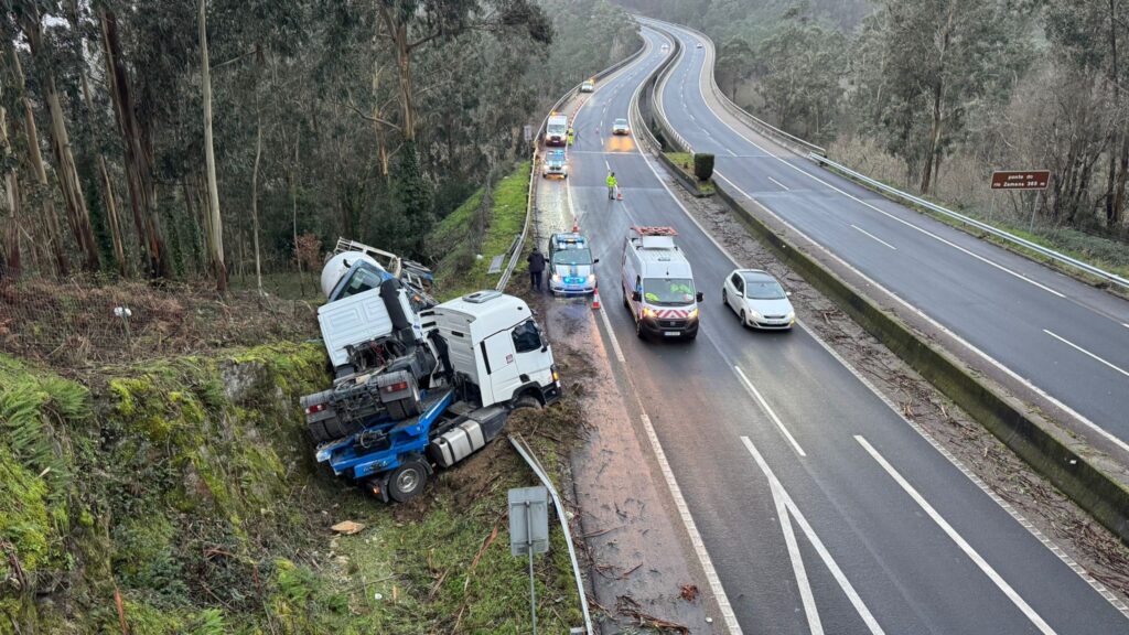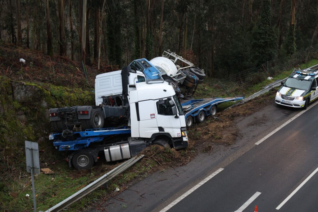 Un tráiler de grandes dimensiones -con un remolque- acabó haciendo la tijera y volcado en la cuneta de la AG57 a primera hora de este miércoles. Ocurrió en el kilómetro 17, a la altura de Vincios, sobre el puente del río Zamáns en Gondomar, mientras se dirigía en sentido hacia Vigo.