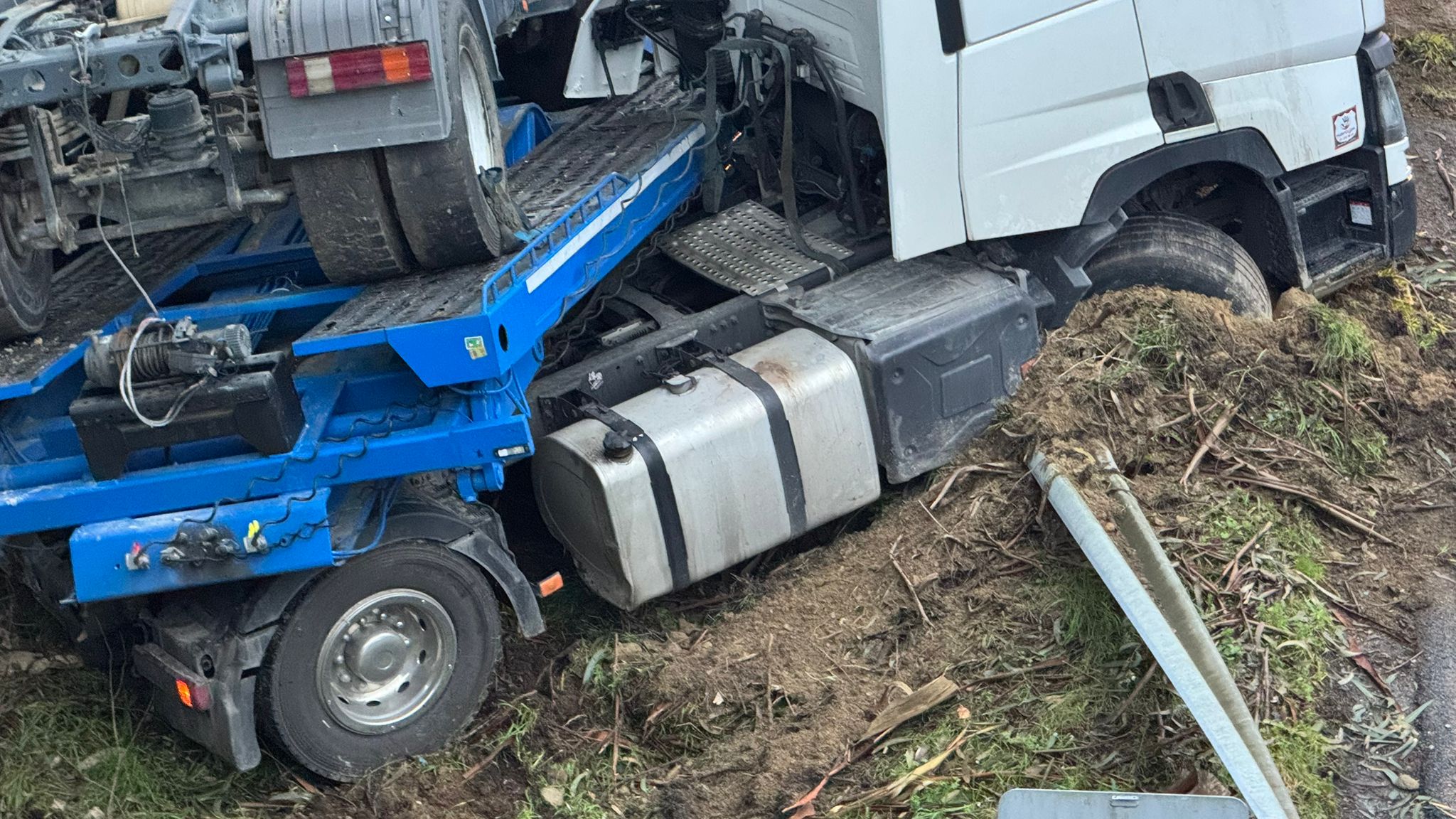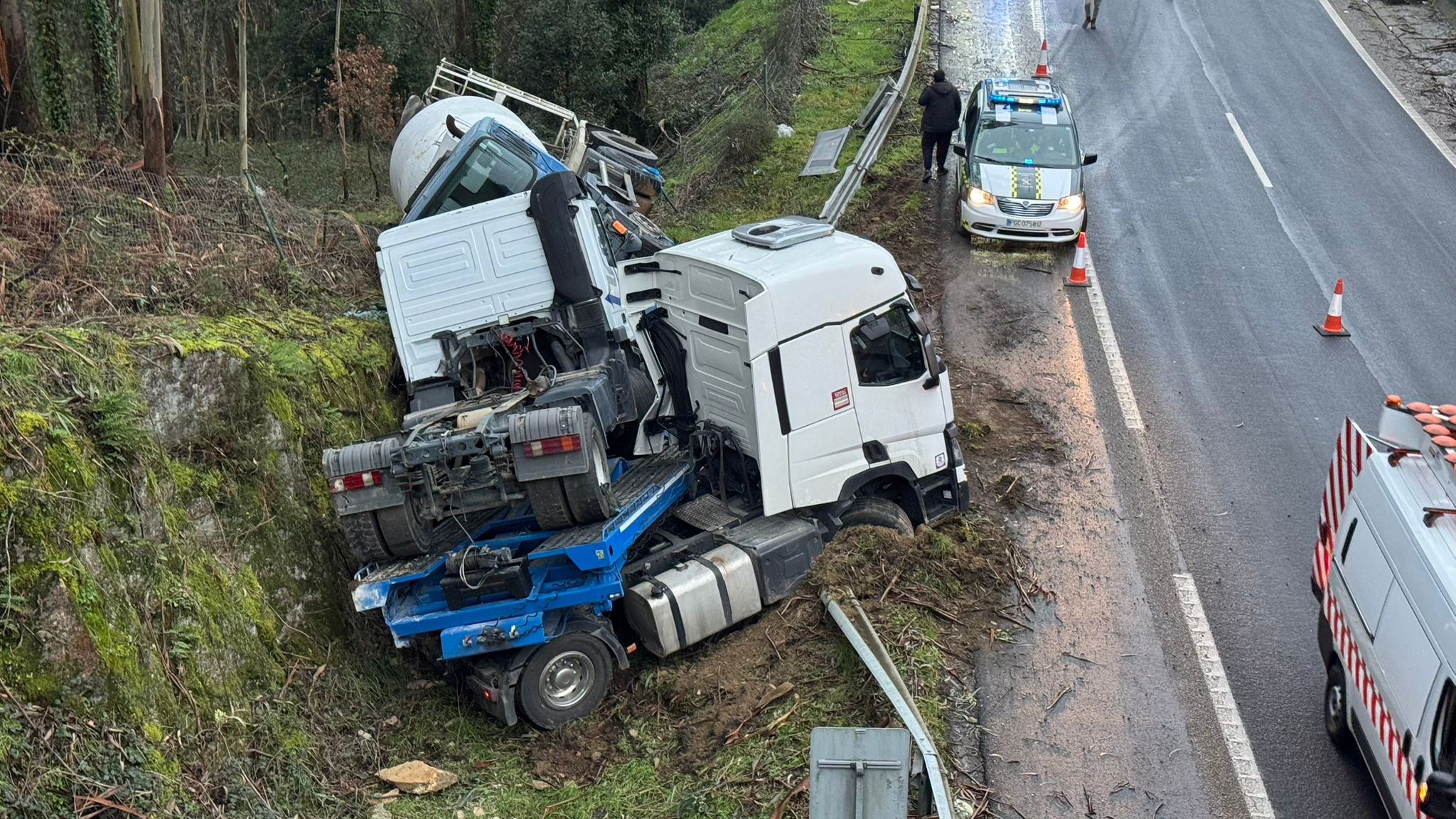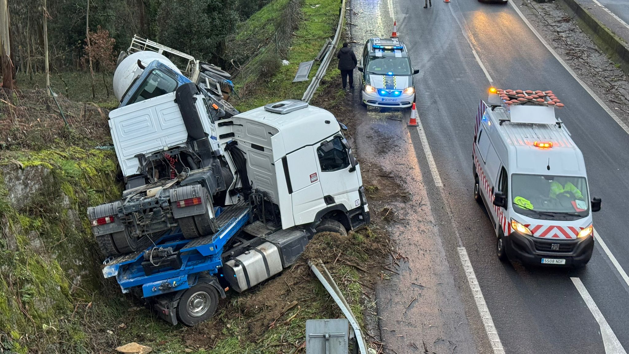 El aviso llegó al 112 alrededor de las 08:30 horas por la llamada de un particular, que en un primer momento indicó que se trataba de dos camiones que habían colisionado. Más tarde, se concluyó que había sido un tráiler que en su remolque llevaba otro camión -una hormigonera- y que se había salido de la vía.