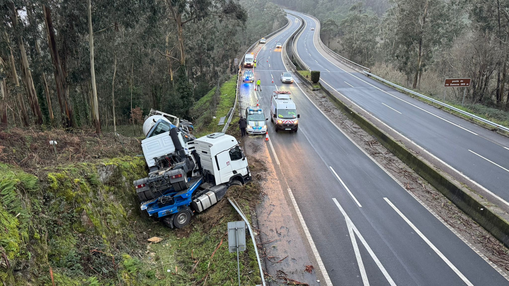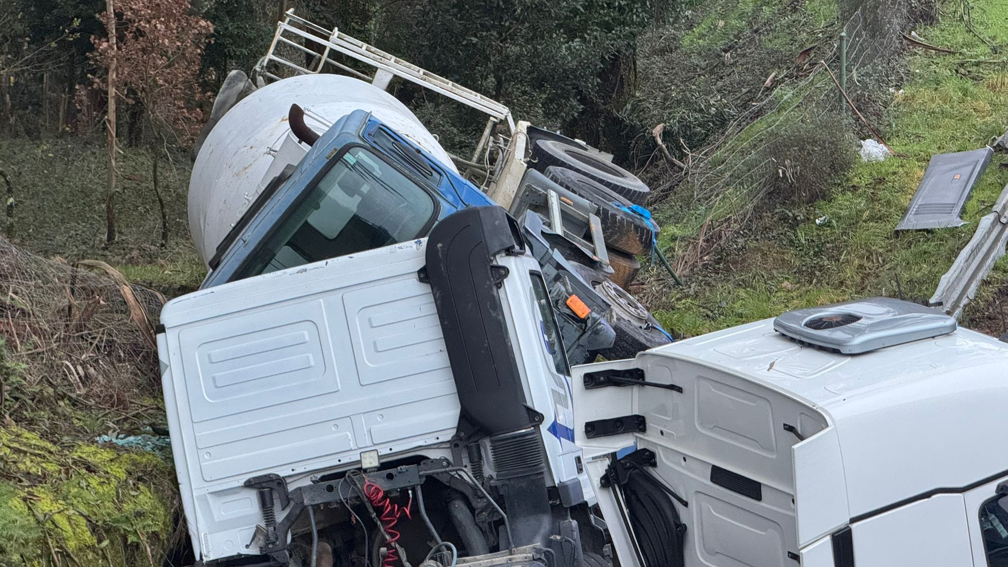 Un camión (con una hormigonera encima) acaba volcado tras un aparatoso accidente en el puente del río Zamáns