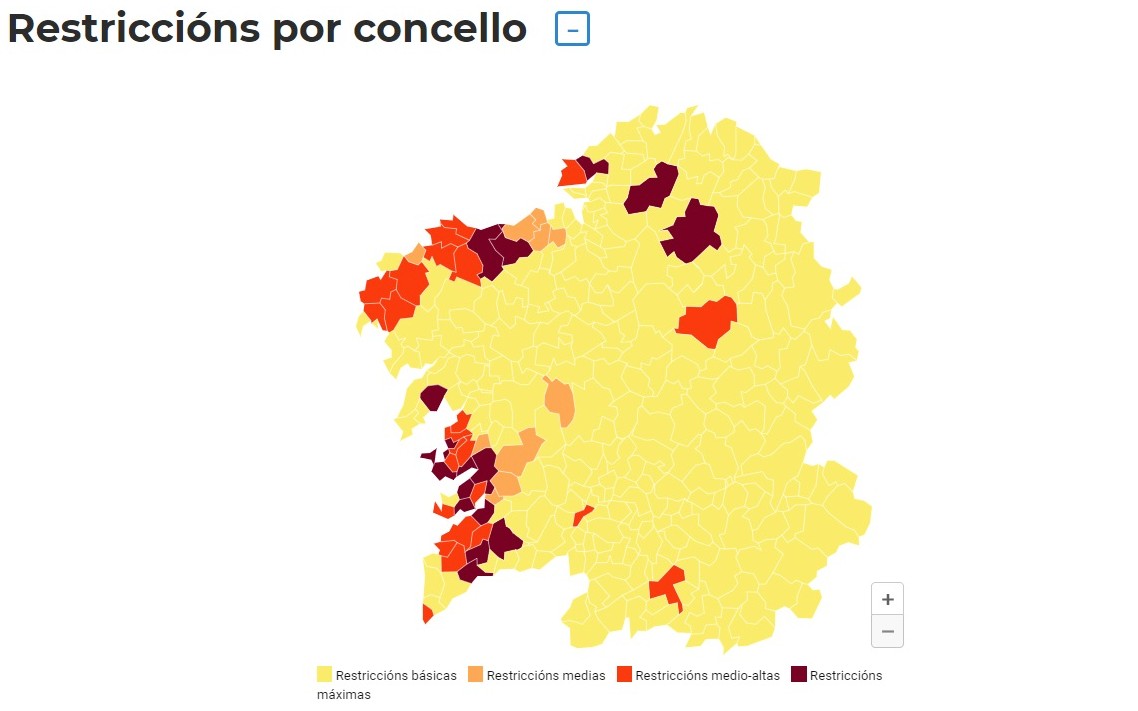 La Consellería de Sanidade ha incorporado este domingo en la página oficial en la que ofrece datos de la pandemia un nuevo mapa en el que informa de las restricciones en cada municipio. Así, desde ahora figuran todas las normativas de cada concello en tiempo real en la web del coronavirus.