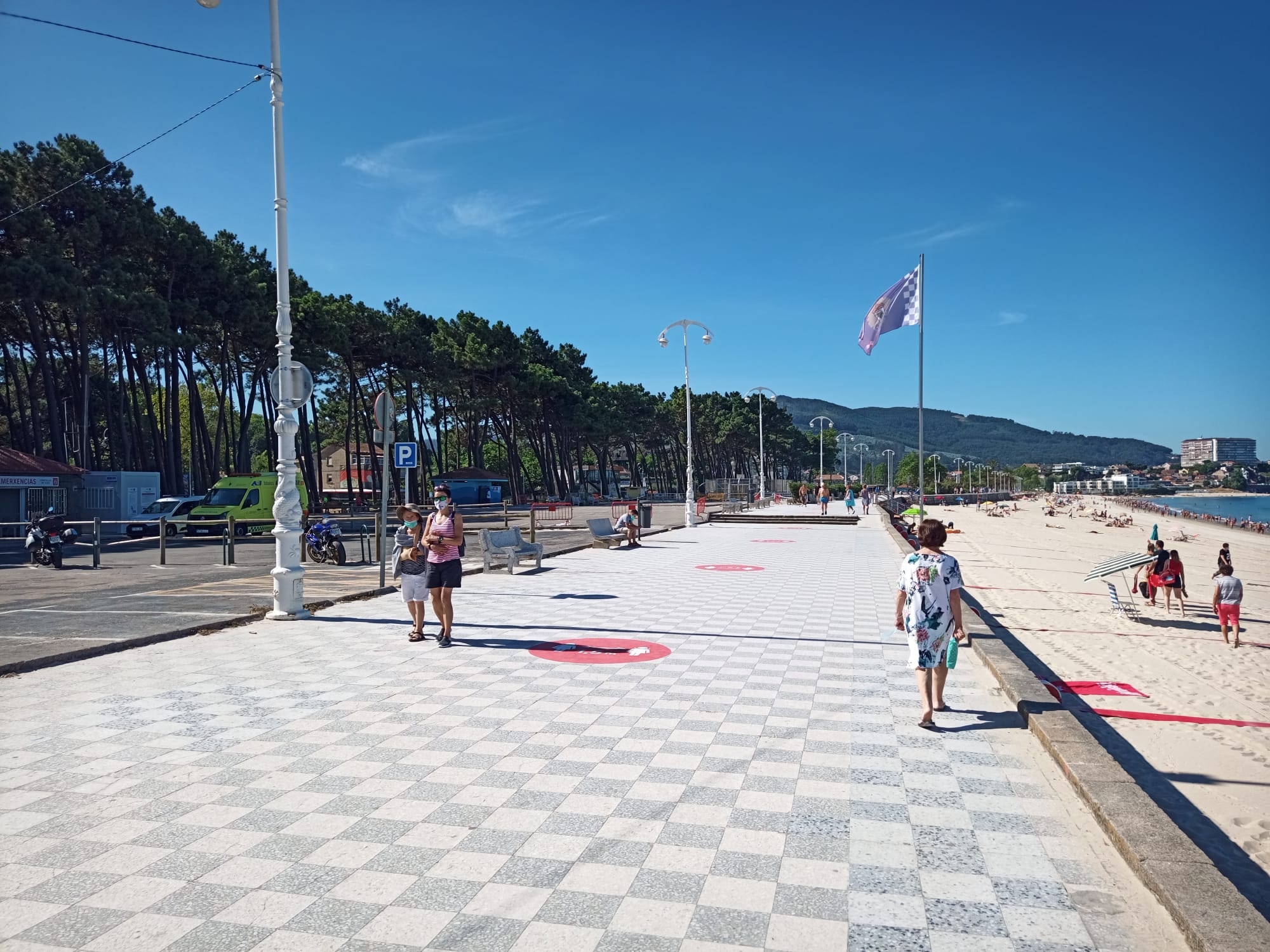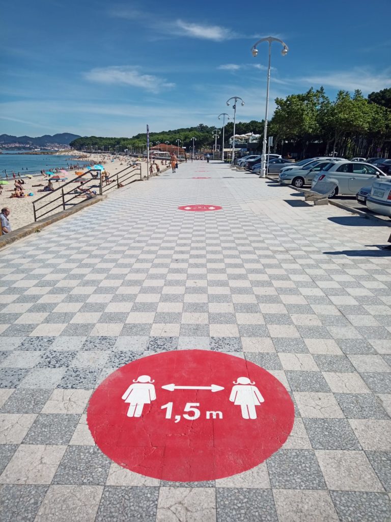El Concello de Vigo espera poner en marcha este jueves el sentido único en el paseo de Samil, una medida ya había sido adelantada hace meses por el alcalde, Abel Caballero, y que se extenderá a la calle Príncipe. El Ayuntamiento lleva varios días señalizando la zona y confía en tener todo listo para este 16 de julio. En un primer lugar, se están pintado 330 círculos rojos de 1,5 metros de diámetro –uno cada 9 metros- para marcar las distancias de seguridad. El siguiente paso será dibujar unas huellas de pies a los lados para dejar claro se debe caminar siempre por la derecha. También se indicará cómo entrar en el arenal con una señalización “distinta”.