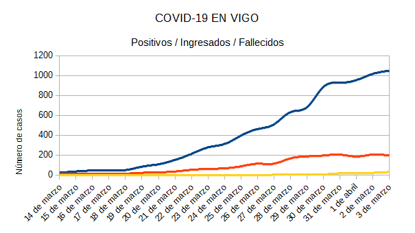 Según los datos difundidos este 3 de abril por la Consellería de Sanidade, el área de Vigo contabiliza 1.049 pacientes con Covid-19. Se trata de 31 más que los registrados el jueves después de que el Sergas completara 1.964 pruebas en el conjunto de Galicia en las últimas 24 horas. El incremento es inferior al del día anterior.