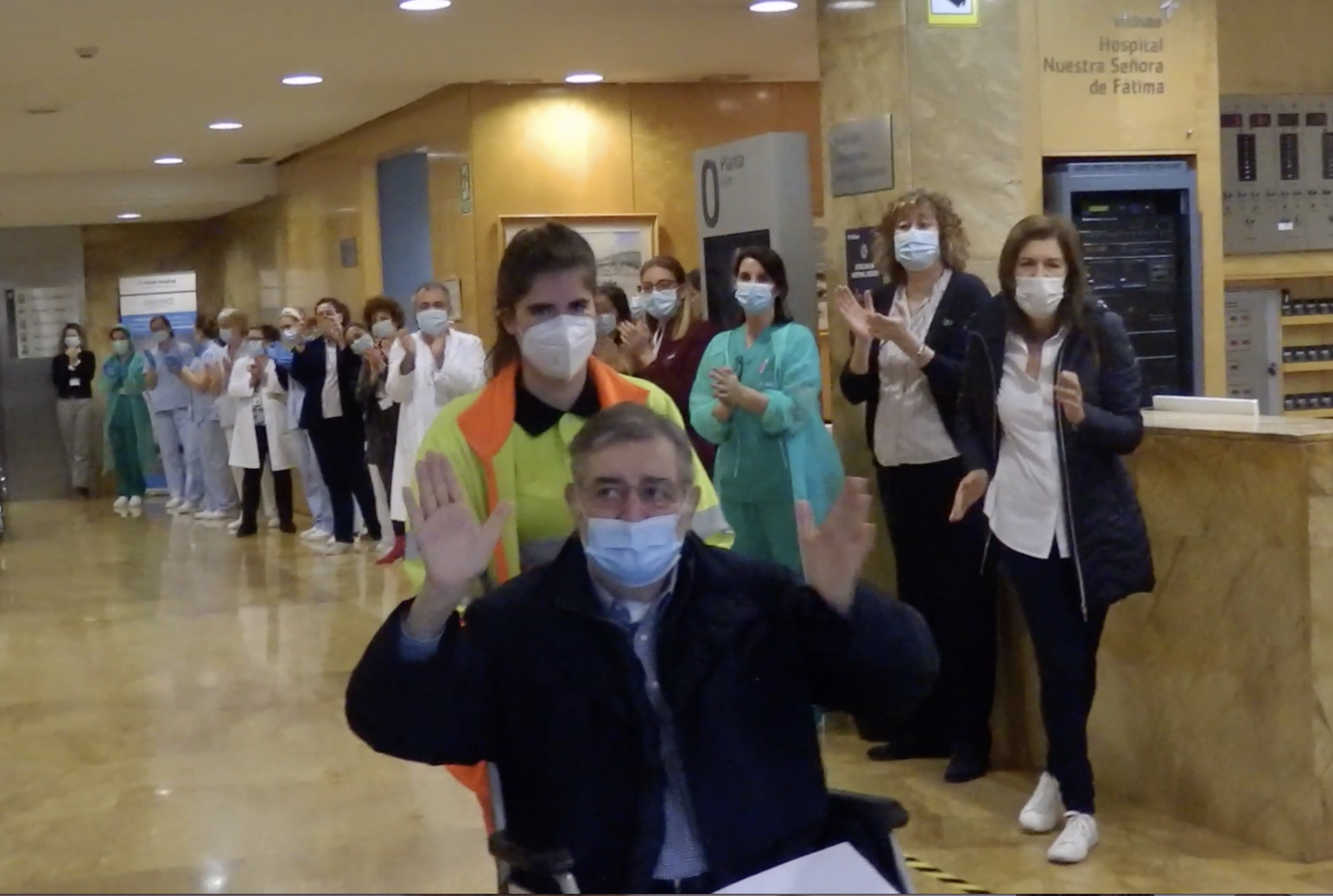 La pandemia está dejando muchas imágenes emotivas, gran parte de ellas en el momento de dar el alta a pacientes que han superado el Covid-19. Se trata de un momento sentido en el que la persona que ha logrado curarse y el personal sanitario se congratulan y felicitan mutuamente. El Hospital Vithas Fátima de Vigo ha vivido este jueves uno de esos instantes tan especiales al despedir a Cardenio, la primera persona que ingresó en el centro tras contagiarse.