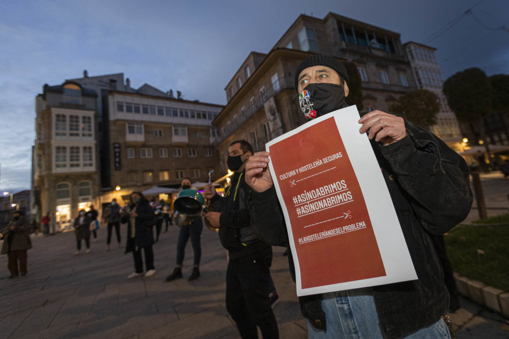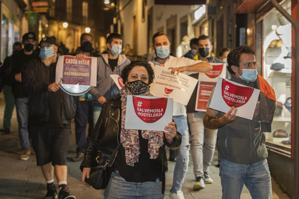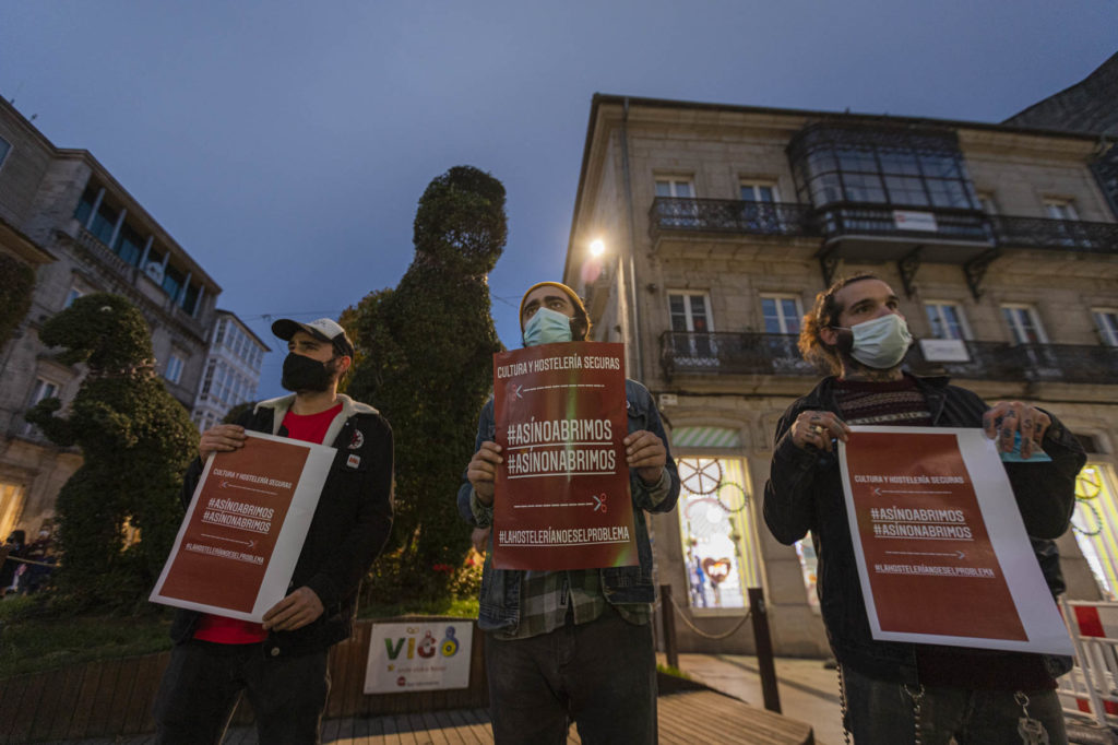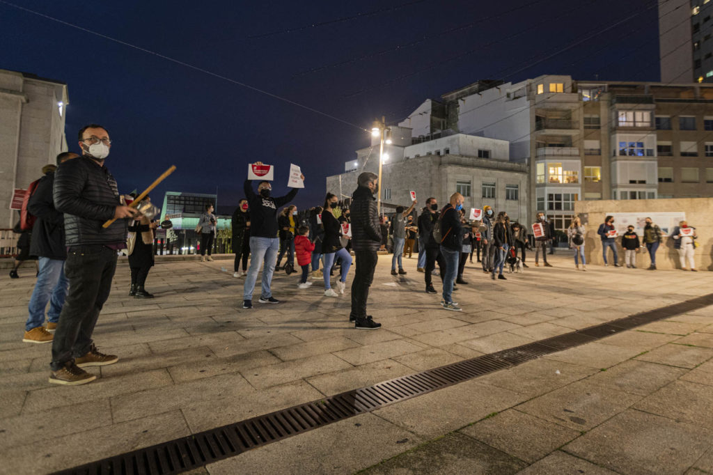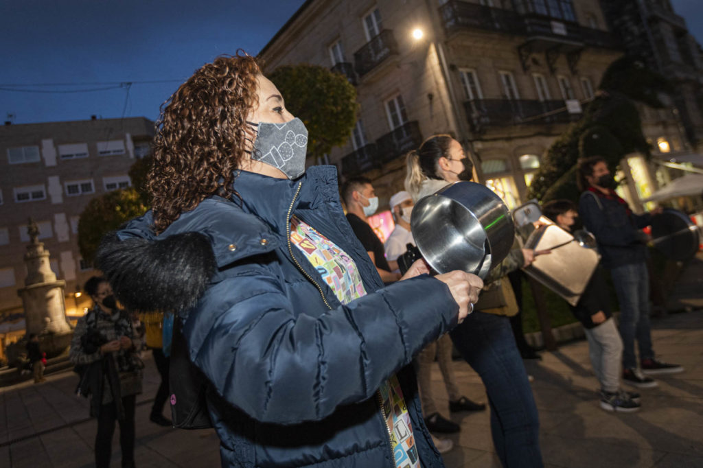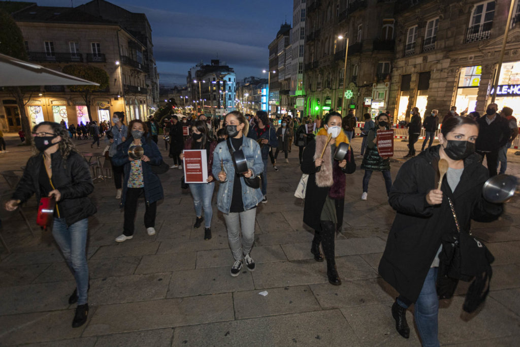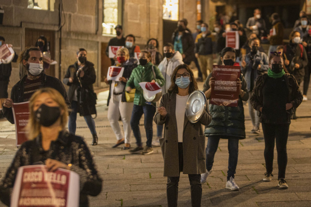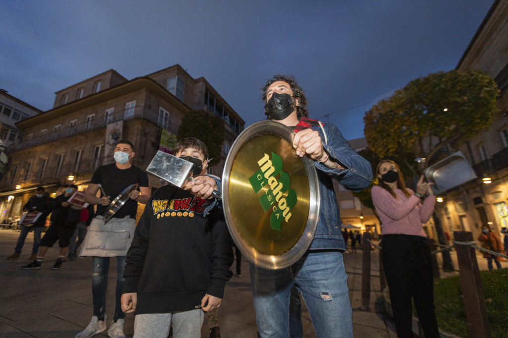 Una decena de hosteleros del Casco Vello de Vigo (Papaxoubas, Princesa, Alta Fidelidad, A Mina, La Consentida, El amante, Buqué, Lume de carozo, Capitán, La favorita, Taberna La Bastarda, A Patela, Haiku, Calma Chicha, El Salón y Uno Está) y otros tantos de la zona de Churruca realizaron a las siete de la tarde una cacerolada en la Porta do Sol y un recorrido por la zona vieja tras echar la verja de sus locales. Era su forma de protestar por las medidas tomadas por la Xunta de Galicia ante la evolución de la segunda ola de la pandemia del Covid-19.