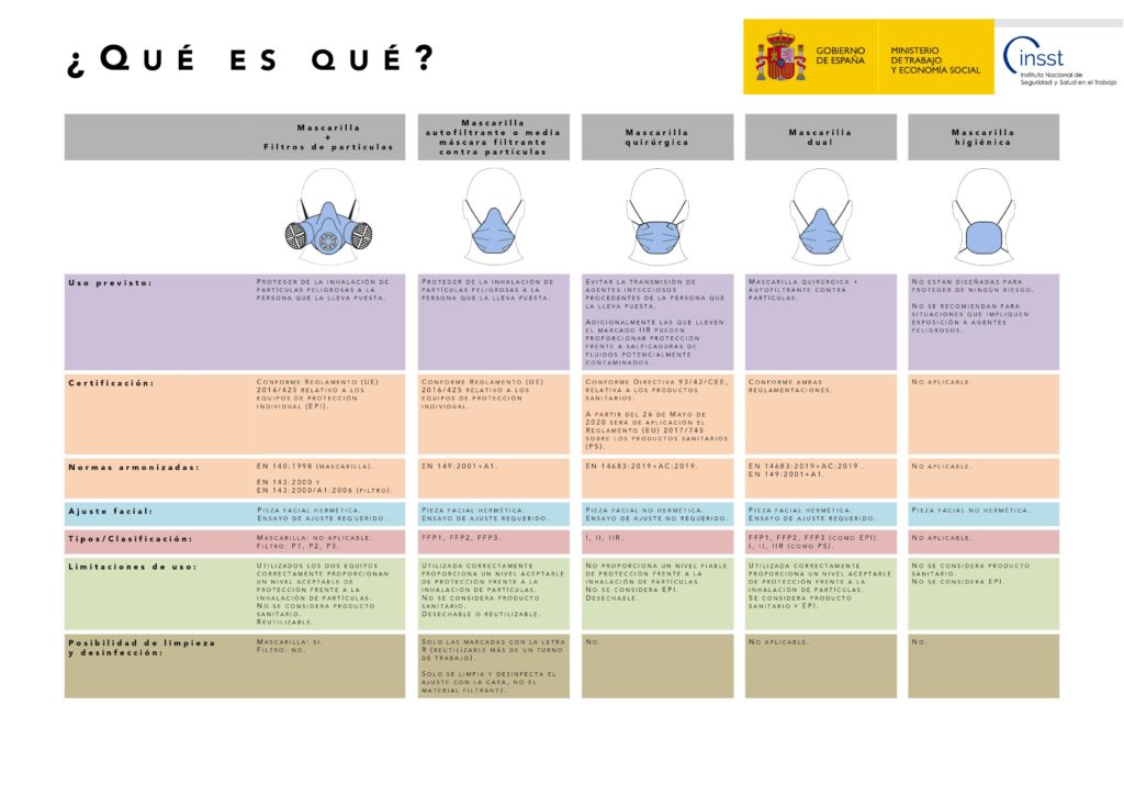La utilización de mascarillas se está haciendo imprescindible para evitar la contaminación personal y la propagación de la epidemia del Covid19 (ya son obligatorias en el transporte público desde el 4 de mayo). En este sentido, conviene comentar que el Instituto Nacional de Seguridad y Salud en el Trabajo (INSST) de España tiene tipificados los diferentes tipos de mascarillas y sus utilidades, así como las normativas aplicadas y otras consideraciones, como las posibilidades de reutilización de cada tipo. Resumimos aquí lo más esencial, disponiendo de una información mucho más completa en la propia página de la mencionada institución, desde donde pueden descargarse, también, varios documentos informativos en formato PDF.