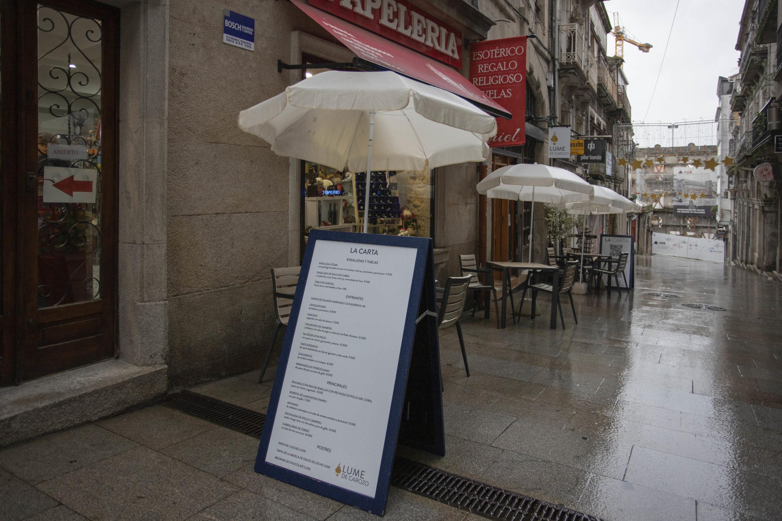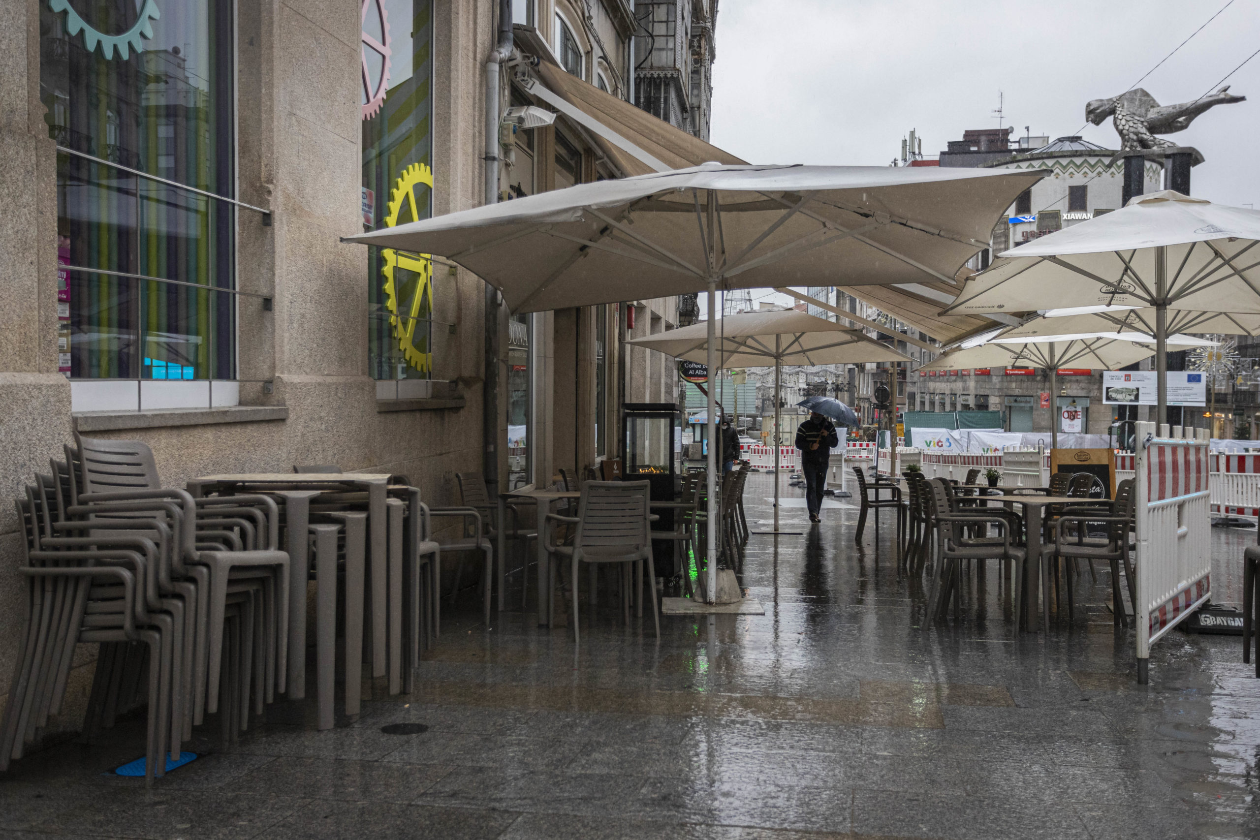 La hostelería viguesa esperaba con ansia el momento de reabrir tras casi un mes de cierre pero no se imaginaba que el escenario sería tan desangelado como el que presentaba la ciudad este viernes por la mañana. El frío y la lluvia han condicionado totalmente el regreso de los desayunos en la cafetería, de los vermús, de las comidas y hasta de las sobremesas. El tiempo no invita a permanecer en las terrazas –disponibles al 50%- y muchos locales se han visto abocados a subsistir con ese 30% de aforo permitido en el interior.