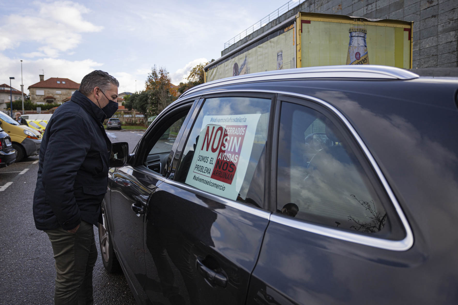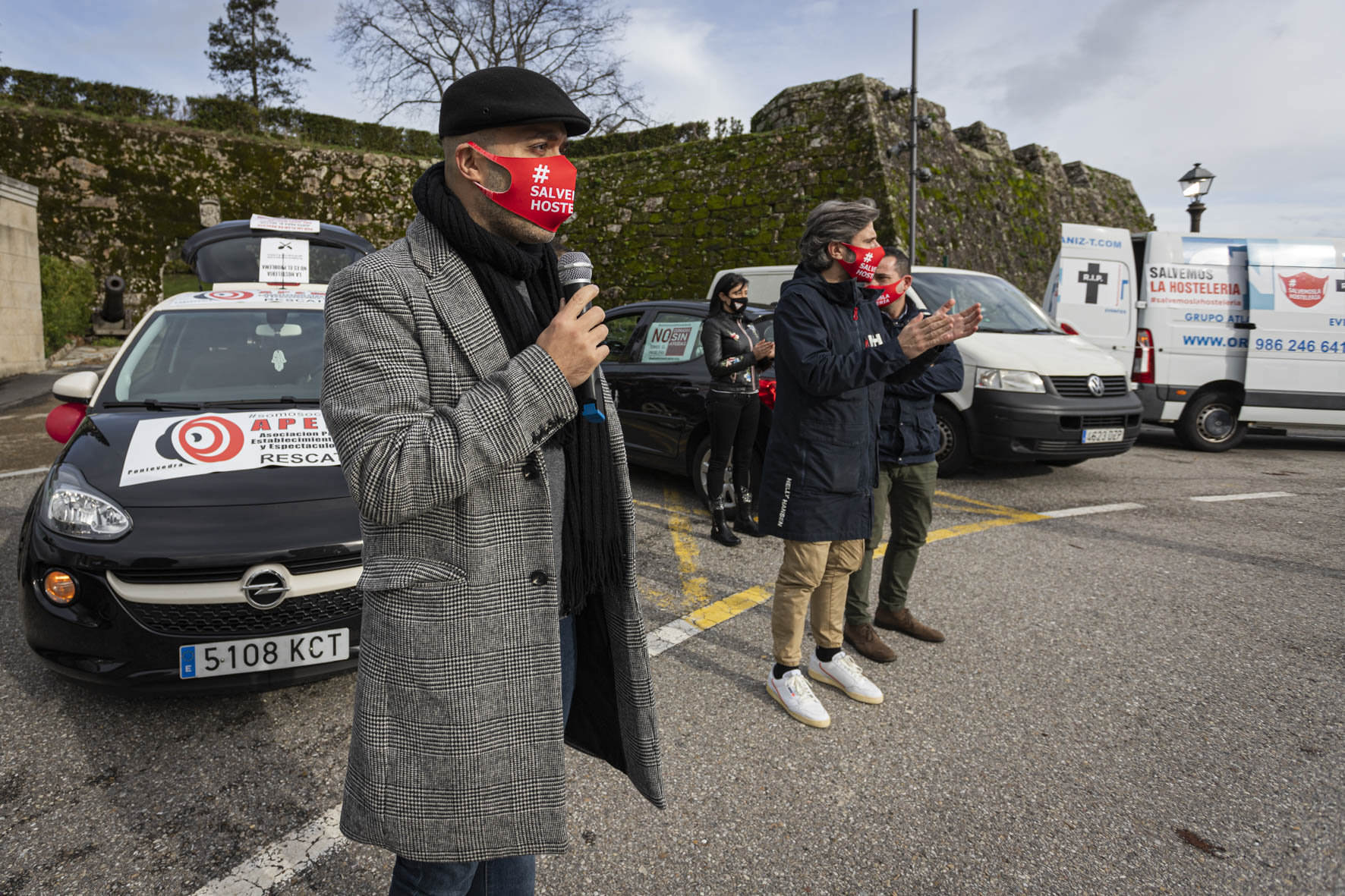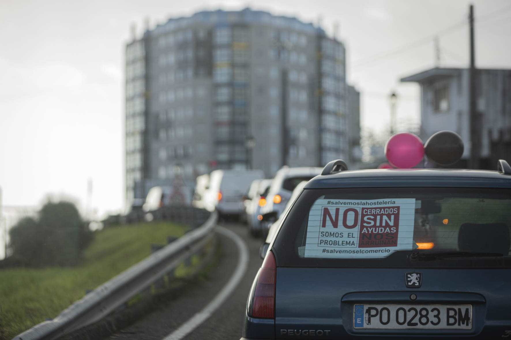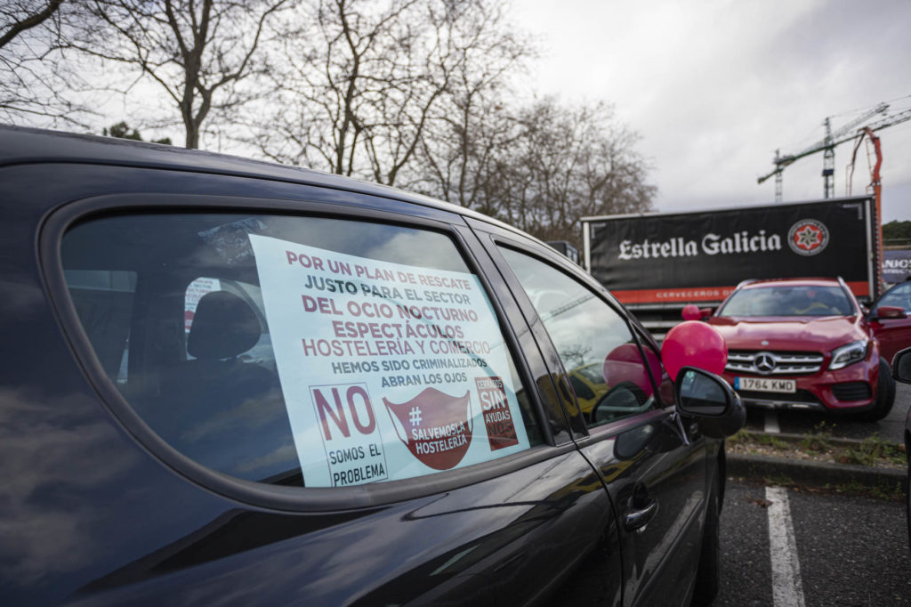 El sector de la hostelería se hizo ver y oír de nuevo este martes por las calles de Vigo. Una larga caravana de coches partió por la mañana de Samil para recorrer la ciudad hasta acabar en O Castro. Era imposible no percibir su presencia. Multitud de vehículos, muchos de ellos rotulados, avanzaban haciendo sonar sus bocinas y enviando un mensaje claro: el sector necesita que la administración le arroje un salvavidas. Muchos están con el agua al cuello. No sólo los locales sino también distribuidores, repartidores, músicos, técnicos, taxistas…