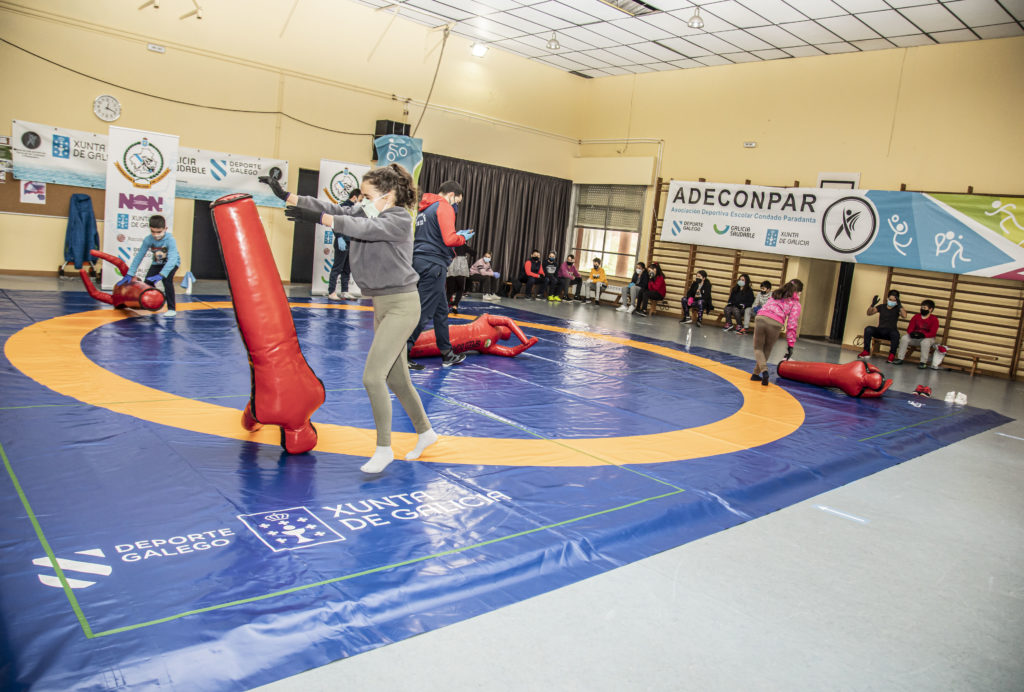 El proyecto piloto de fomentar esta iniciativa arrancó con una jornada lúdica y formativa celebrada en horario lectivo. Sobre el tapiz de 100 metros cuadrados aportado por la Federación Galega de Loita e D.A., las alumnas y los alumnos ponteareanos tuvieron la oportunidad de descubrir esta actividad de “oposición directa”, sin adversario.