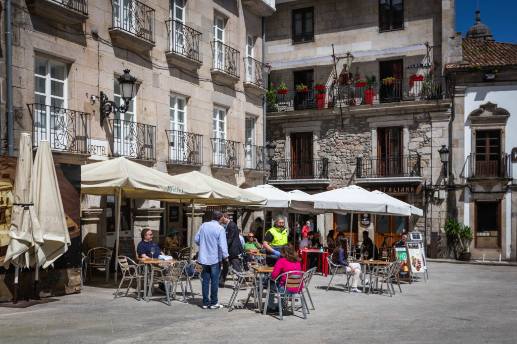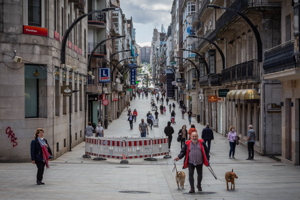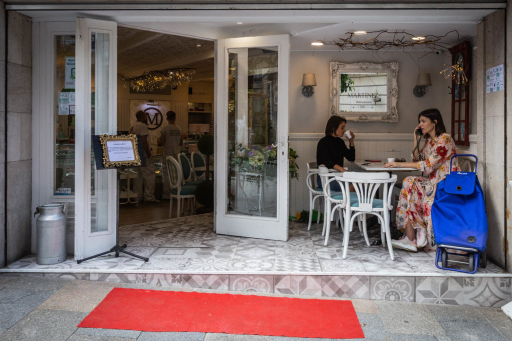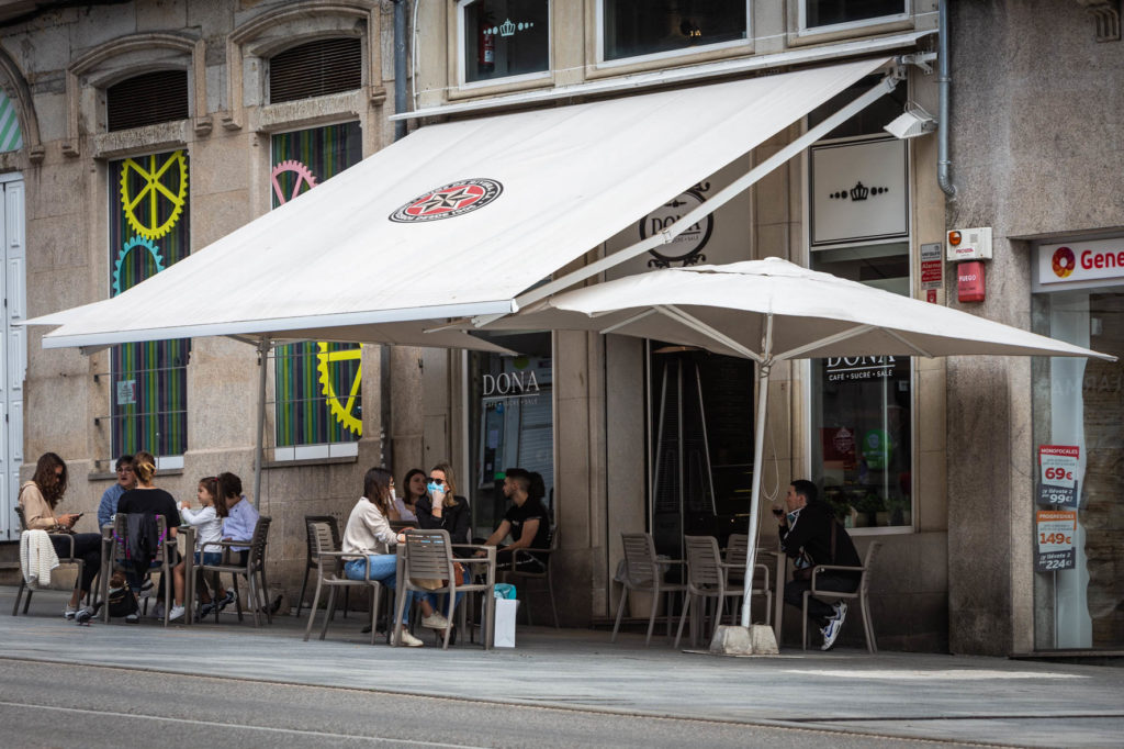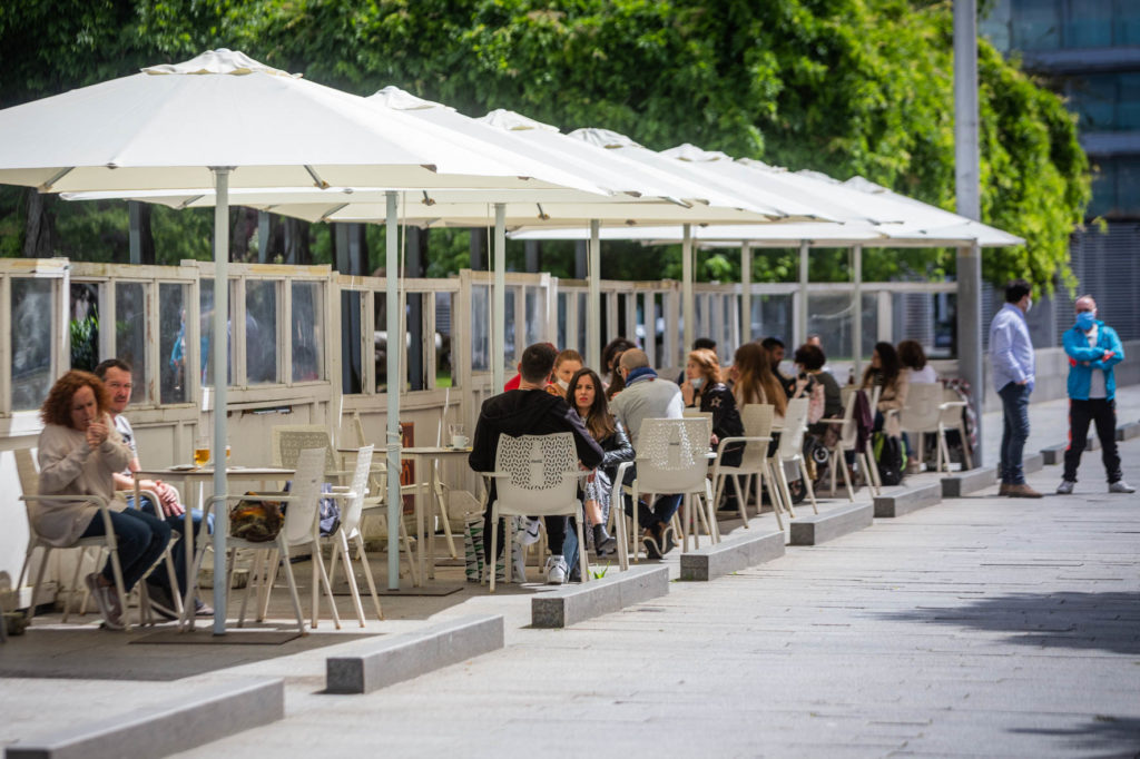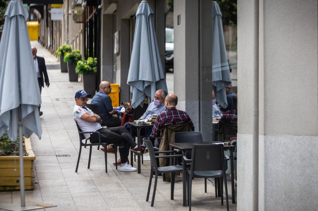 Aunque fuese con el freno puesto, el regreso del pequeño comercio y muchas otras actividades permitió que el centro de la ciudad cobrara vida. Al menos, más vida que en las semanas pasadas. Precisamente muchos de los usuarios de estas terrazas eran trabajadores que aprovechaban para tomarse un café o un descanso.