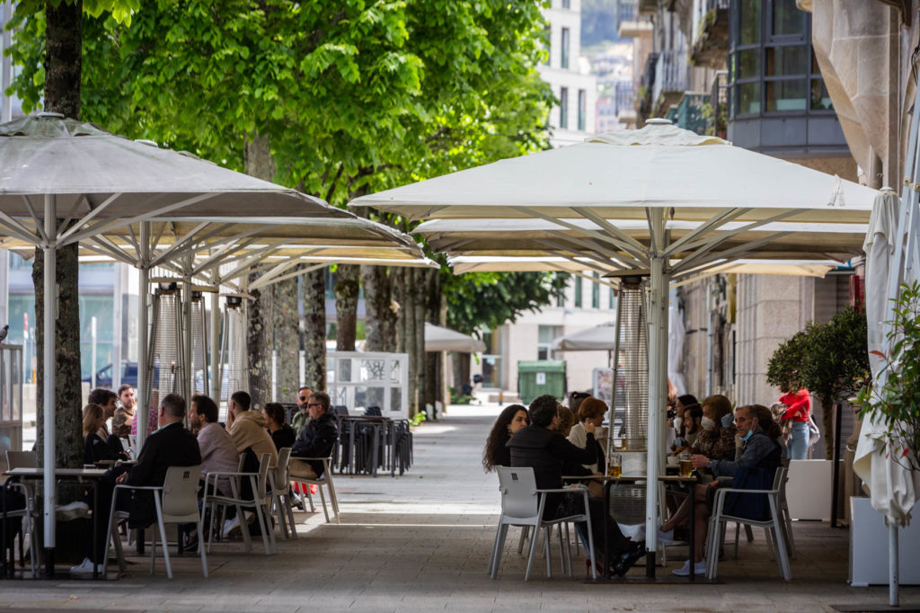 Había ganas de volver a sentir lo que es tomarse algo en una terraza al aire libre. Y los hosteleros también ansiaban aumentar (o directamente recuperar) su clientela. Ambos deseos se juntaron este lunes en Vigo durante la primera jornada en la Fase 1 de la desescalada, lo que permitió ver mesas y sillas tomando las aceras. No tardaron mucho en ser ocupadas por los vigueses, que pudieron disfrutar de un desayuno al aire libre primero y de un vermut o una caña después.