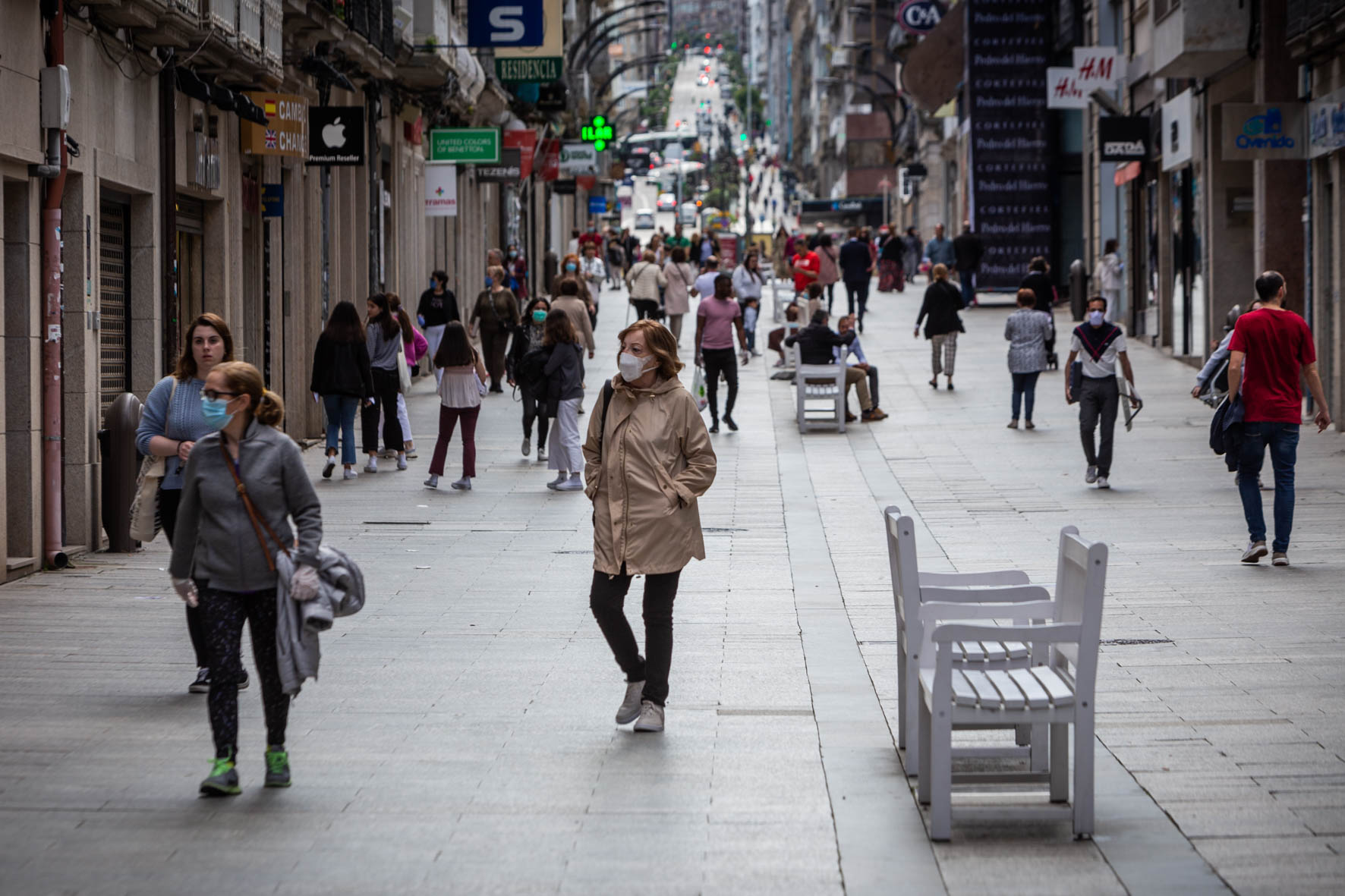 Aunque fuese con el freno puesto, el regreso del pequeño comercio y muchas otras actividades permitió que el centro de la ciudad cobrara vida. Al menos, más vida que en las semanas pasadas. Precisamente muchos de los usuarios de estas terrazas eran trabajadores que aprovechaban para tomarse un café o un descanso.