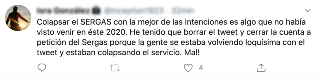 En cuestión de horas, sus mensajes en Twitter se hicieron viral y el propio Israel González tuvo que borrarlo, a petición del Sergas, como él mismo contó en la misma red. Un mensaje que, a su vez, suprimió de nuevo al poco tiempo.