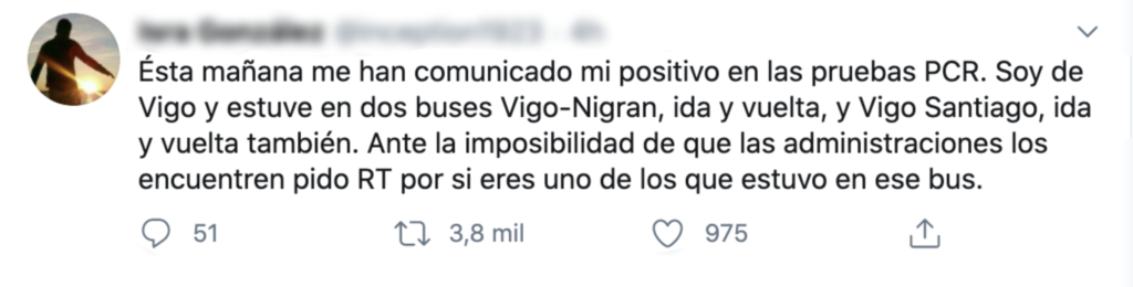 El positivo tras la prueba PCR realizada el viernes se le comunicó al joven este sábado por la mañana, pero antes de ello realizó vida normal, lo que incluye varios viajes en autobús entre Vigo, Nigrán, Baiona y Santiago, además de la visita a un restaurante en el que comió. «Si estuviste en alguno de estos tres sitios llama a tu médico para que te hagan la prueba PCR», pedía en uno de los mensajes en los que detalló las horas en las que realizó dichas actividades.