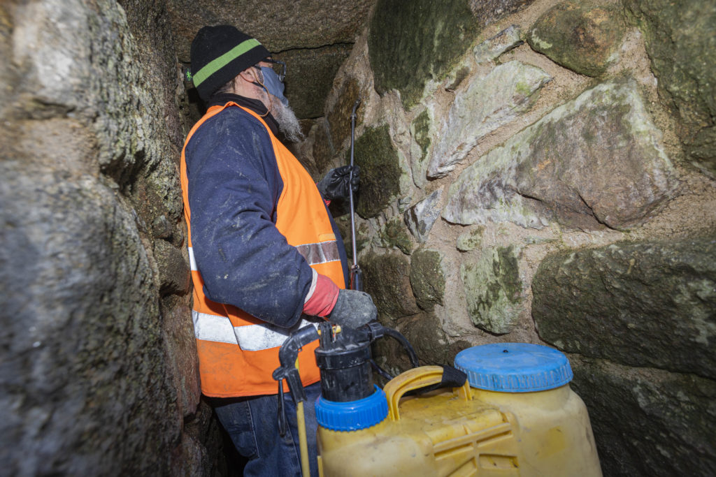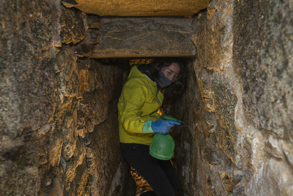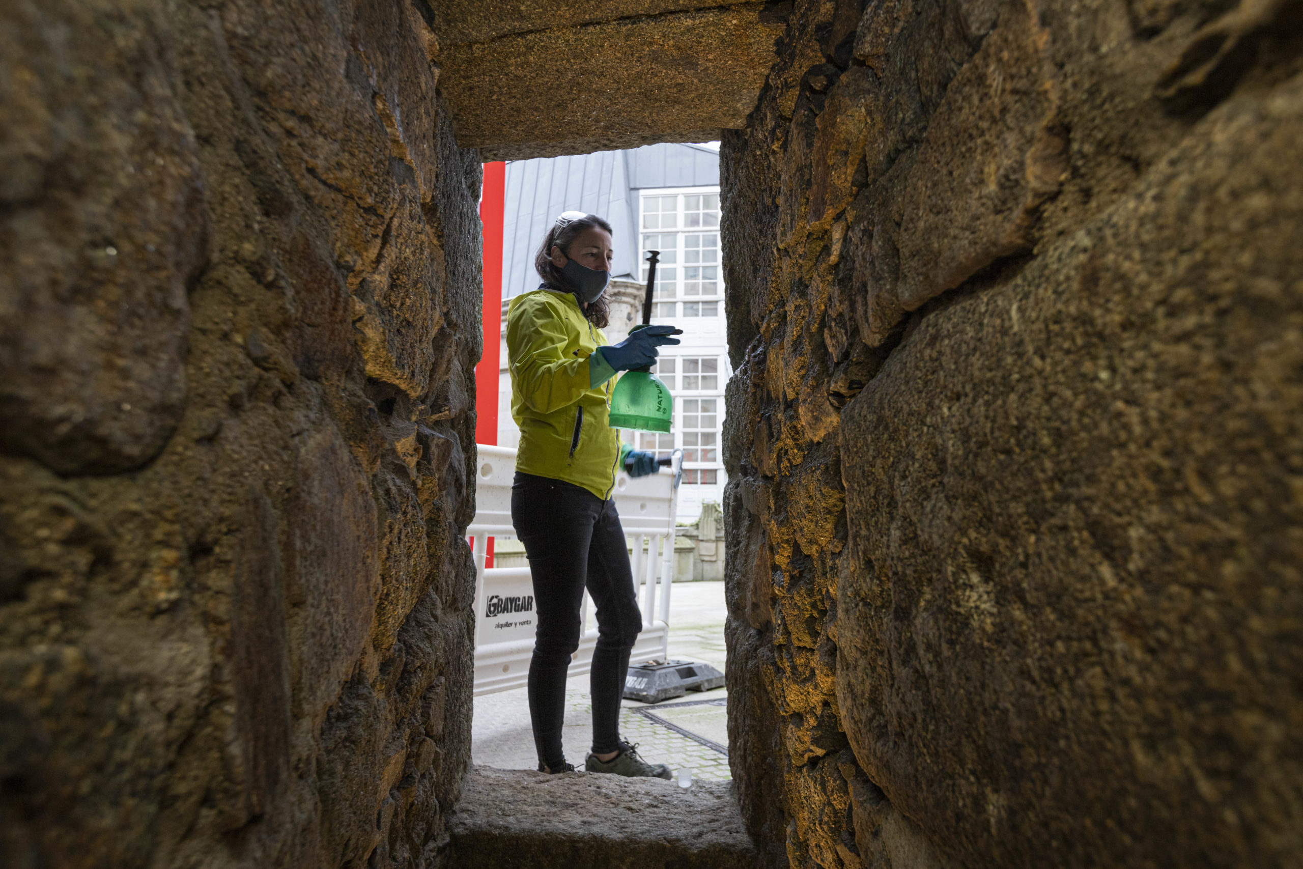 Los trabajos consistieron en el desmontaje del cristal laminado de seguridad, para su limpieza y desinfección, además de la eliminación de depósitos de suciedad y aspersión sobre los muros interiores de un fungicida (cloruro de benzalconio), disuelto en agua desionizada al 0,5% para dejar actuar, al menos durante 24 horas. También se llevó a cabo la eliminación de raíz de plantas superiores, de modo manual, y aplicación de fungicida con el fin de matar las posibles raíces activas.