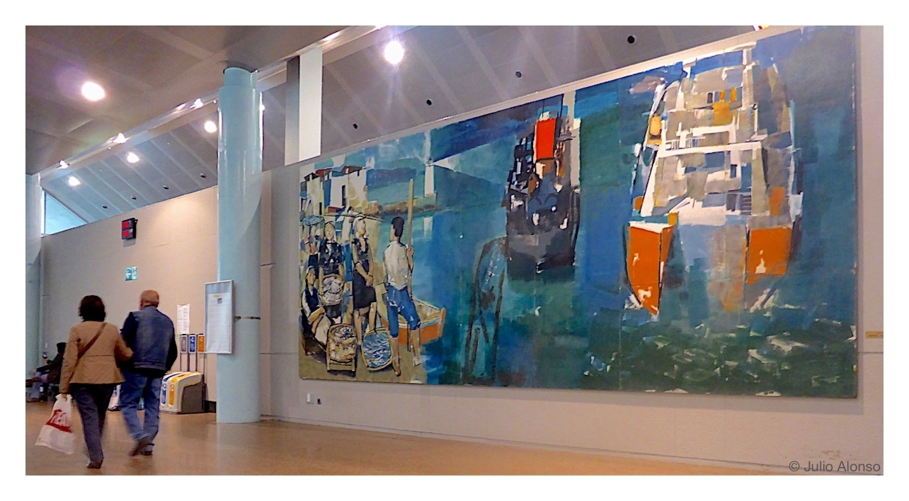 Así lo hizo uno de los máximos exponentes de la pintura gallega: Rafael Alonso (Pontevedra, 1924 – 1995), brillante acuarelista, además de haber desarrollado algunas obras con otras técnicas, como el oleo. El aeropuerto de Peinador, en Vigo, muestra un impresionante mural de su manufactura, y la autoría de Rafael Alonso aparece referenciada en el ángulo inferior derecho. La obra ha sido rescatada con acierto de las antiguas instalaciones aeroportuarias para lucir en una de las paredes de la nueva terminal, cada vez más concurrida.