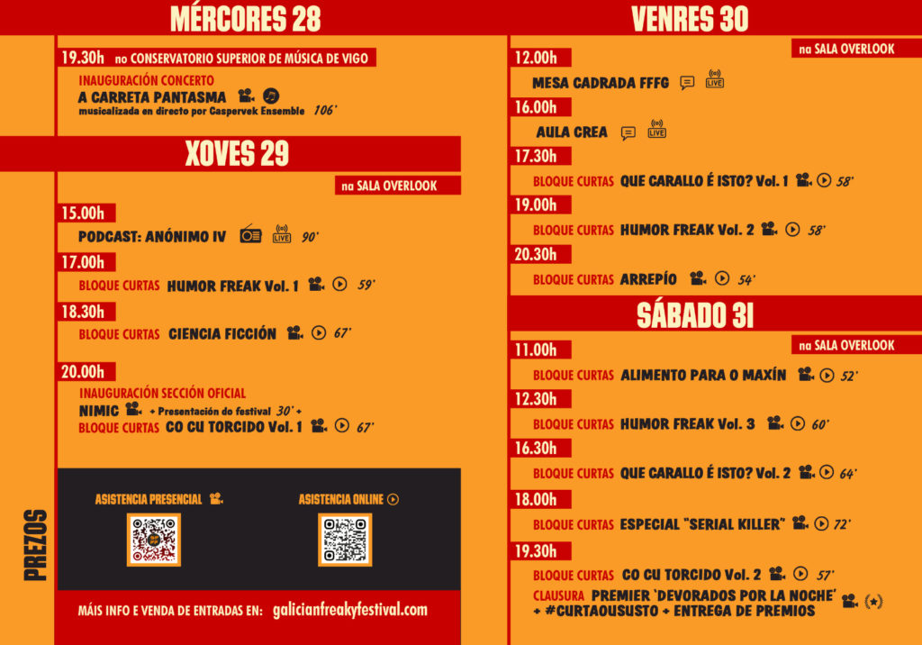 Ademais, debido ao reducido aforo da Sala Overlook, no Hotel Bahía de Vigo, e o estrito protocolo para cumprir coa normativa vixente, tamén existe a posibilidade de ver a sección oficial a través de Internet, na plataforma Festhome, estando dispoñible ata o 8 de novembro.