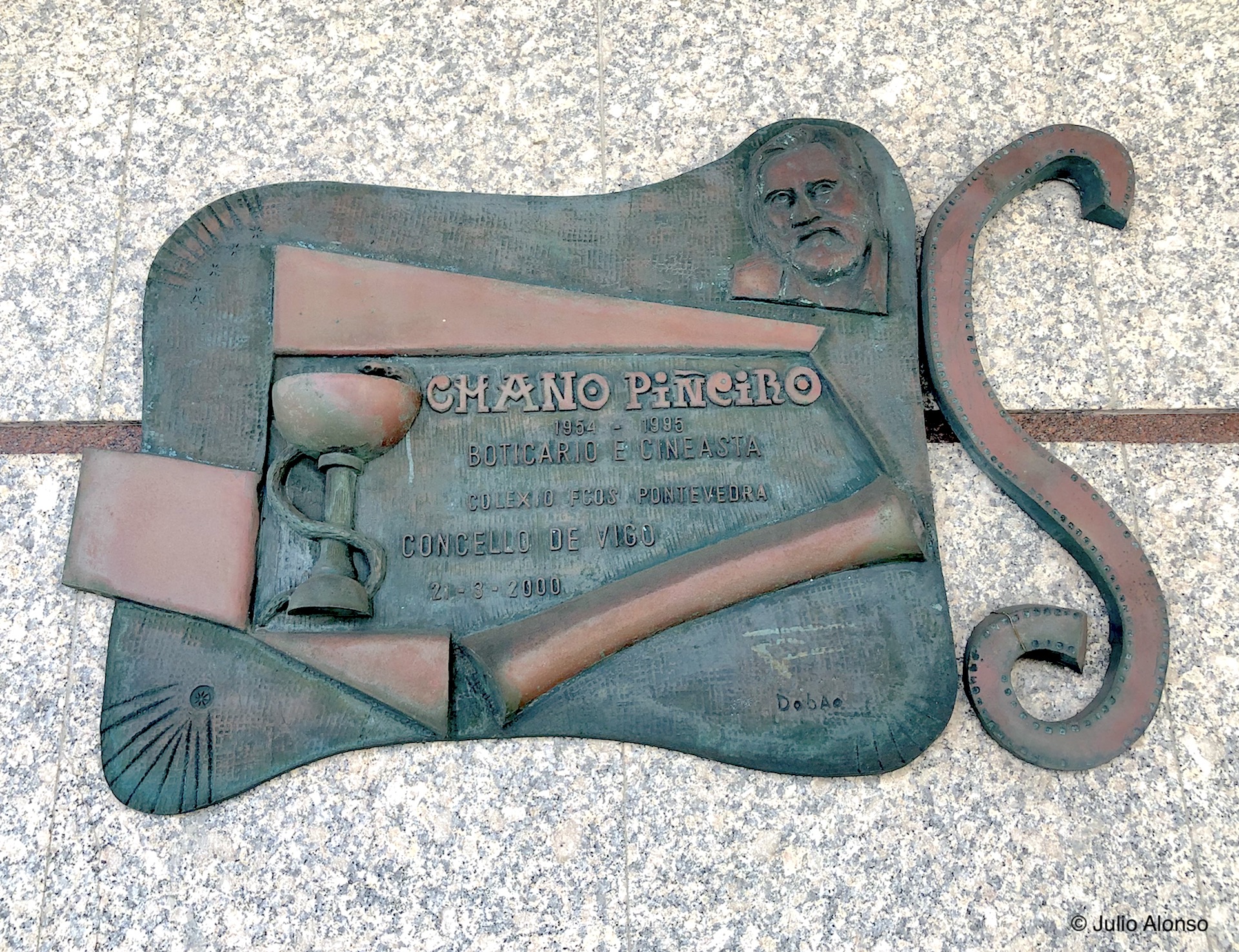 La placa, en la que no suelen reparar los viandantes, está dedicada a Chano Piñeiro, uno de los principales impulsores del cine gallego. Su nombre completo era Luciano Manuel Piñeiro Martínez y era farmacéutico de profesión. Su farmacia estaba ubicada al inicio de la Rúa Torrecedeira y simultaneaba la farmacia con su pasión por el cine.
