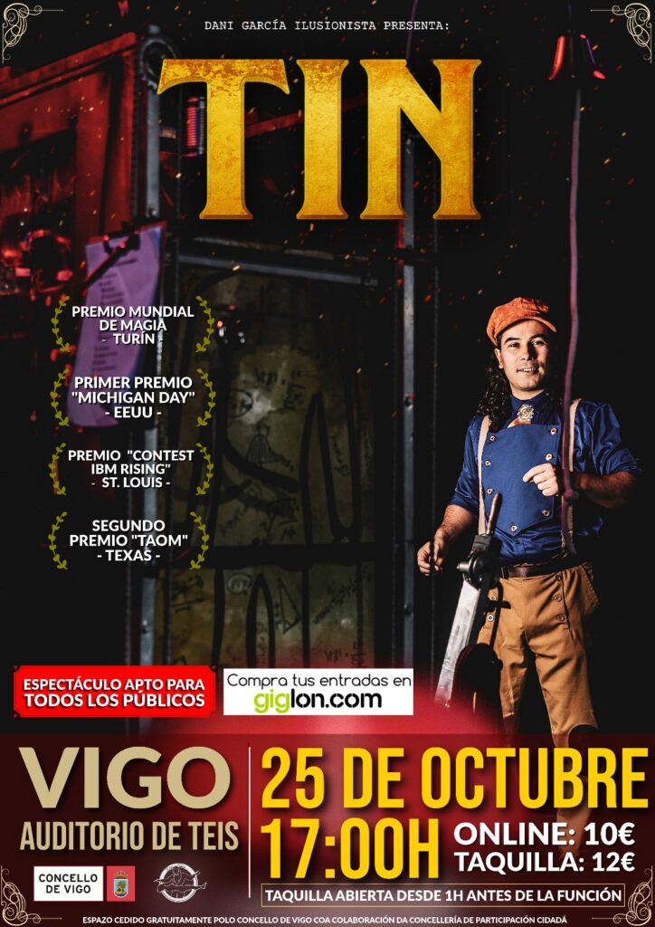A menudo la magia se reduce a trucos de salón relucientes o producciones hiperproducidas al estilo cinematográfico de turno, pero Dani García opera en las grietas, en el espacio donde el asombro nace de la proximidad y no de la pirotecnia. El mago ferrolano, que en 2022 se coronó campeón mundial de magia de calle en el Master of Magic World Convention de Turín con su show Don Gelati, regresa a Vigo con TIN, una de las piezas que lo catapultaron a la escena internacional. Este 25 de octubre, a las 17:00 horas, el Auditorio del Centro Cívico de Teis acogerá su gira nacional, un desvío necesario en una trayectoria que ha zigzagueado por China, EE.UU., Francia, Asia, Italia y Portugal. Entradas a 10 euros online en Giglon o 12 en taquilla, un precio que refleja la esencia accesible de su arte: no elitista, sino para bolsillos y almas abiertas.